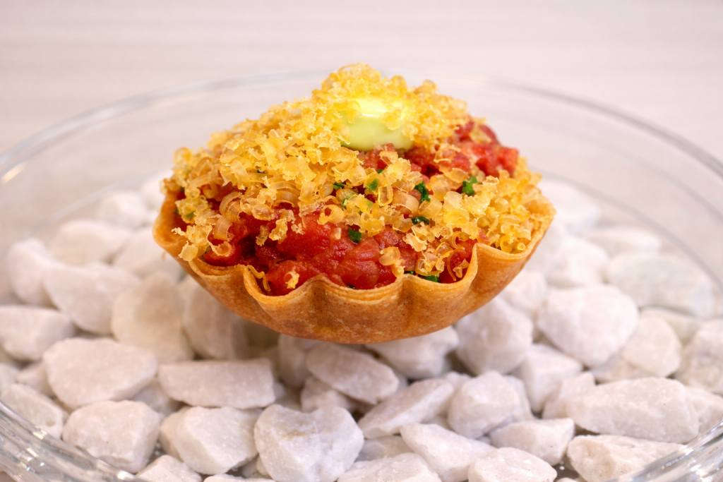 Die Tartelette ist fein gearbeitet, die Hülle knusprig und stabil, das Tatar saftig und präzise gewürzt. Das Eigelb liegt darüber wie ein verbindendes Detail.