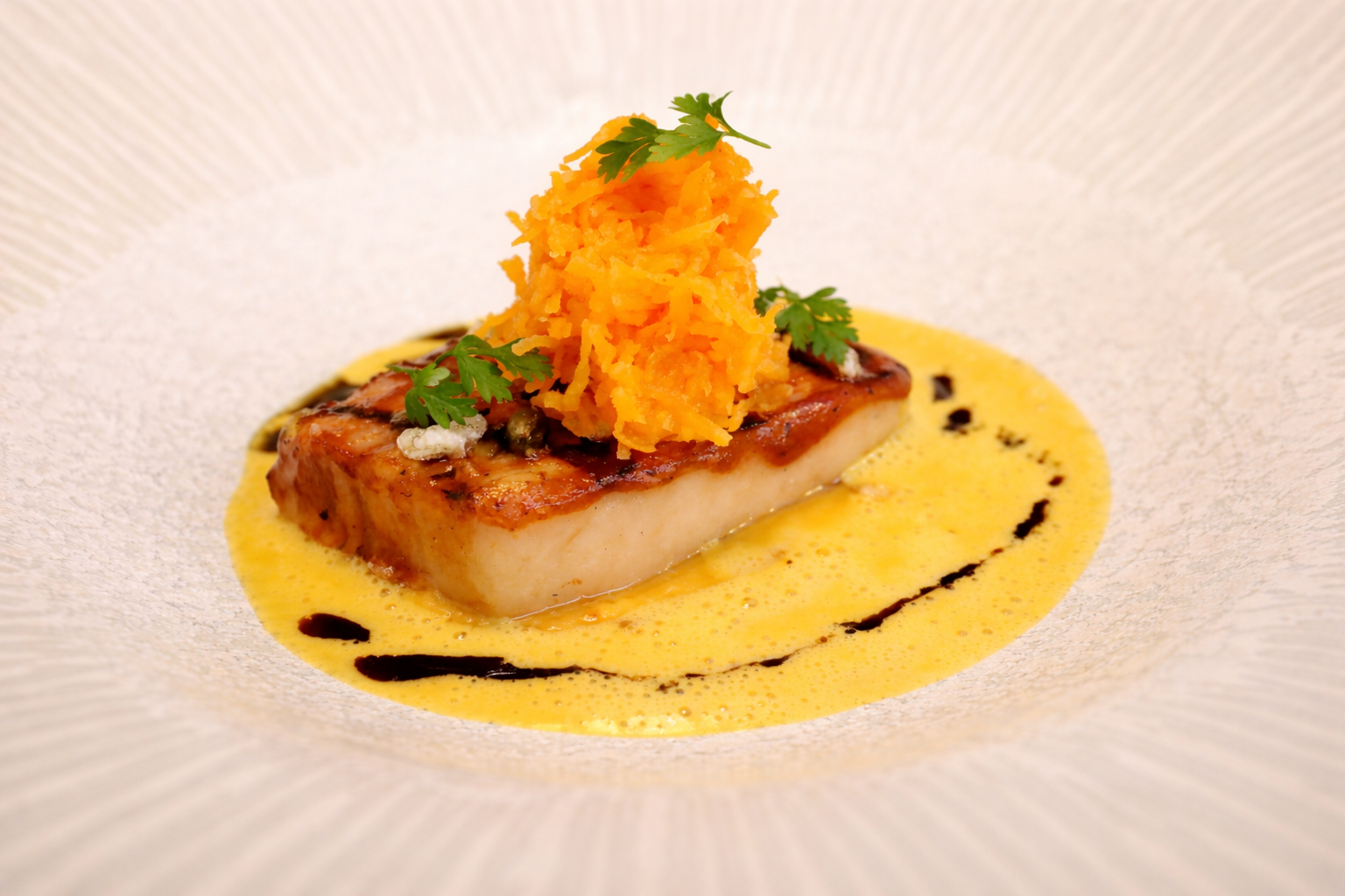 Darunter liegt eine aufgeschäumte, gelb leuchtende Sauce mit Anklängen von Kürbis und Süßkartoffel, die eine angenehme, leicht süßliche Grundierung liefert, ohne ins Schwere zu kippen.
