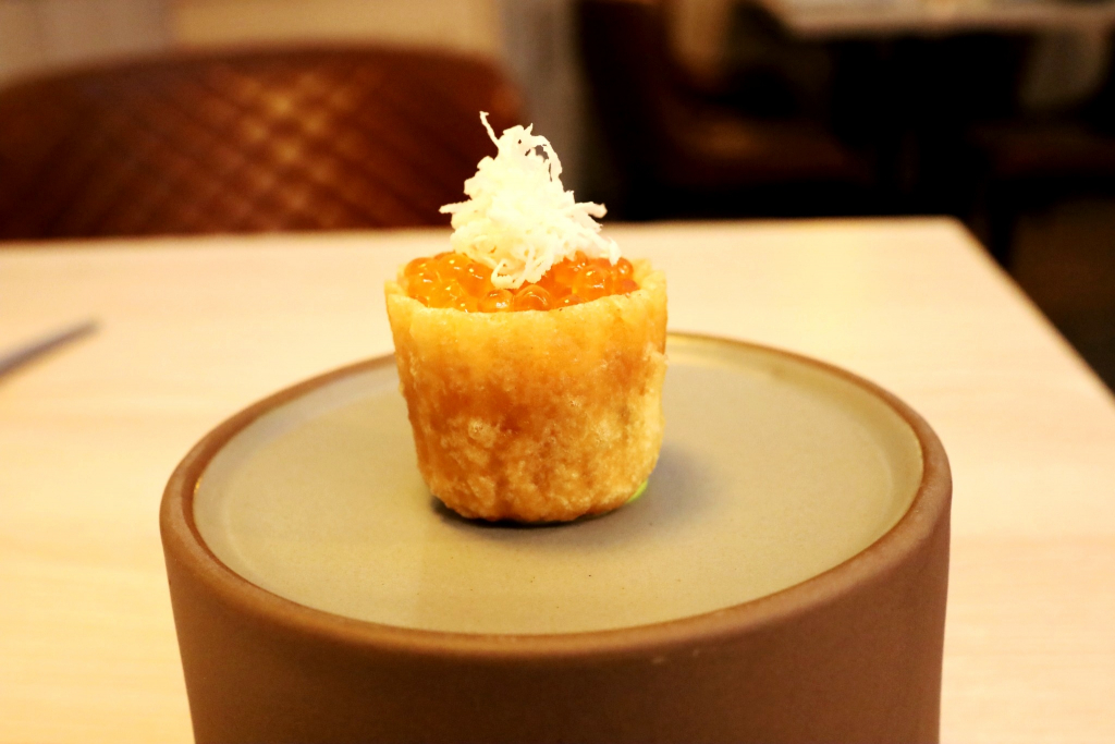 Kleines Extra an diesem Abend: ein knuspriges, fein ausgebackenes Tartelett, gefüllt mit Forellenkaviar. Obenauf etwas frisch geriebener Meerrettich, der eine klare, kurze Schärfe setzt und die salzige Aromatik angenehm auflockert.