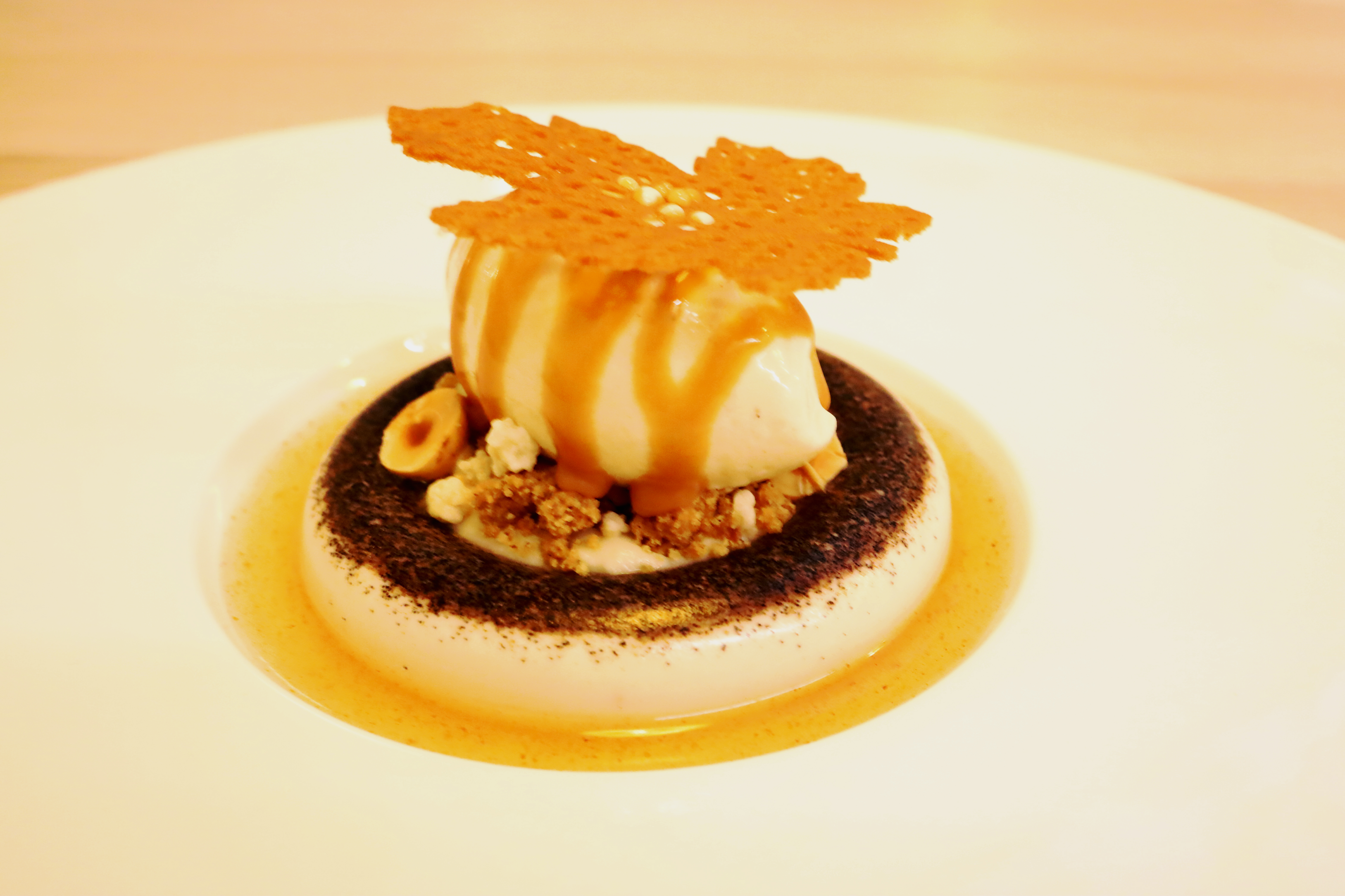 Sehr schön auch die Texturkontraste: die glatte, kühle Panna Cotta, dazu knusprige Elemente und die fließende Karamellkomponente.