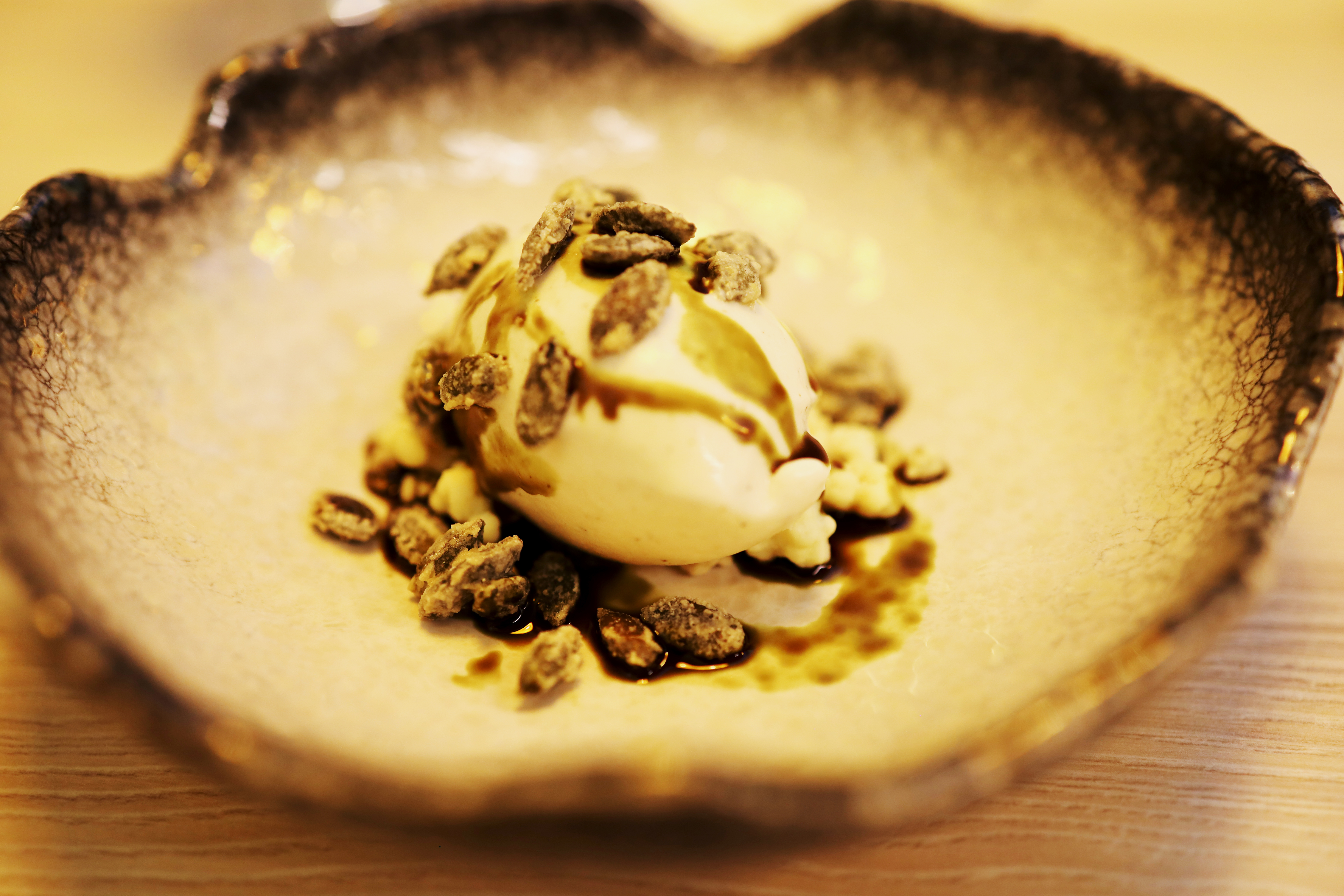 Nach dem Dessert folgt noch ein kleiner Ausklang: eine saftige Zitronen-Madeleine, separat dazu ein Joghurt-Rahmeis mit Kürbiskernöl und gerösteten Kürbiskernen – nussig, leicht herb gebrochen und angenehm erfrischend.