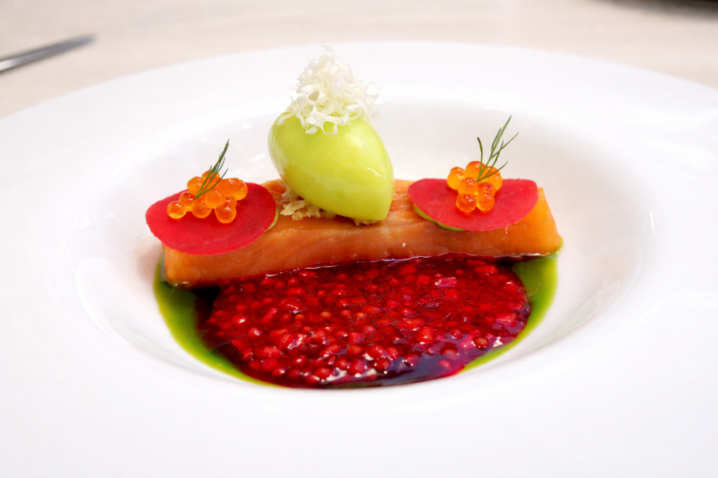 Lachsforelle, Rote Bete, Meerrettich, Apfel, Dill
