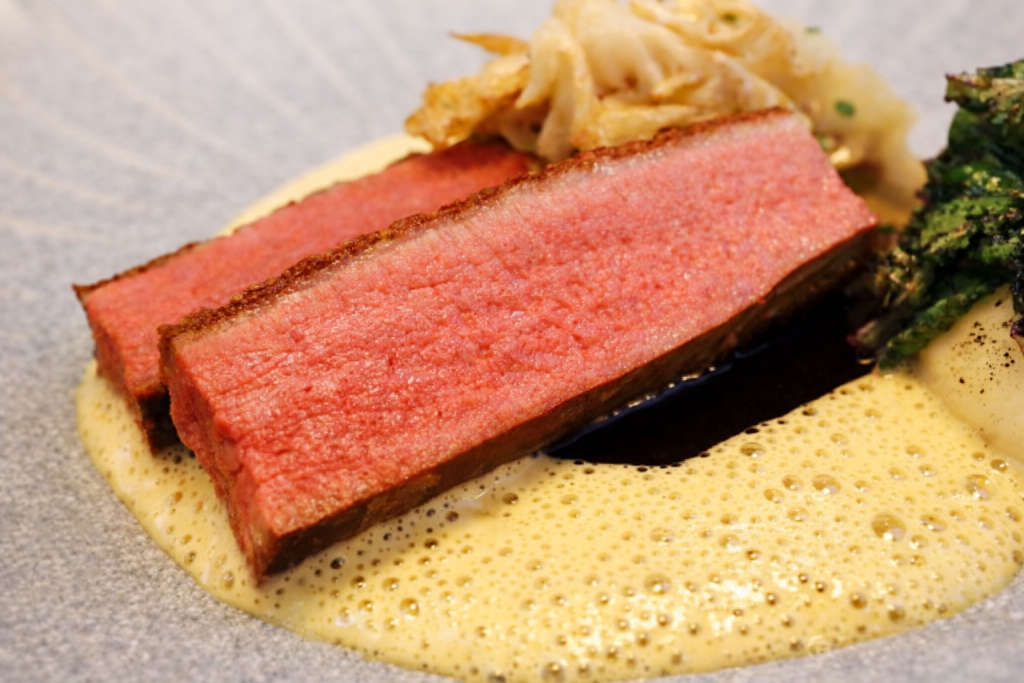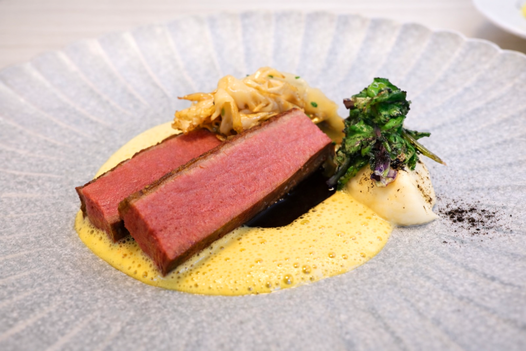 Die geschäumte Vadouvan-Beurre-blanc bringt eine warme, fein gewürzte Aromatik ins Spiel, die sich ruhig unterordnet und dem Fleisch eher eine zusätzliche Ebene gibt, als es zu überdecken.
