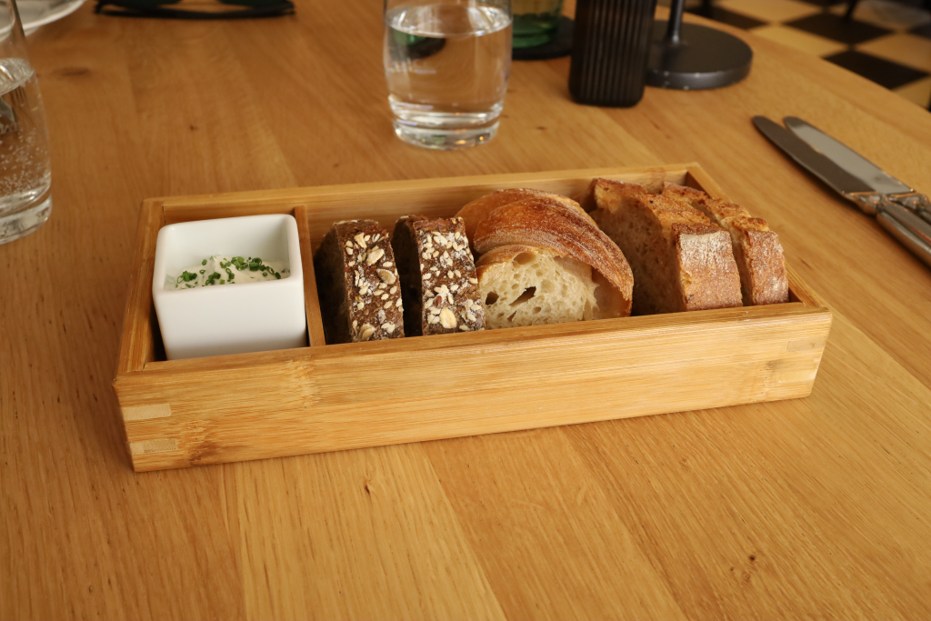 Zum Brot wird eine kleine Auswahl gereicht, präsentiert in einer schlichten Holzbox, die eher an eine feine Brotzeit als an klassische Fine-Dining-Routine erinnert.