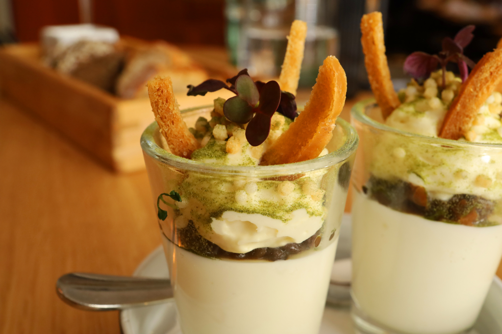 Serviert und annonciert von Henrik Jessen, einem angenehm unaufgeregten, sehr sympathischen Auszubildenden im dritten Lehrjahr, kommt das Dessert als bewusst vielschichtiger Teller daher – fast wie ein frühlingshafter kleiner Garten.