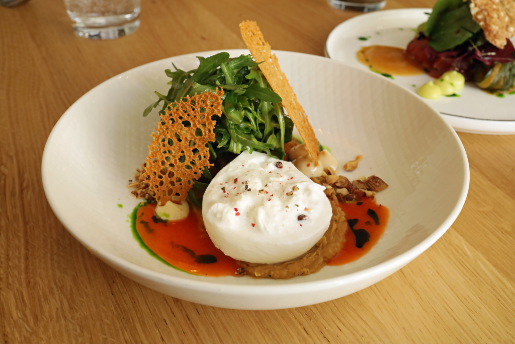 Im Zentrum eine sauber gearbeitete, cremig fließende Burrata, die eine jene milde, milchige Fülle mitbringt, die als ruhender Pol dient. Darunter ein Auberginenragout, das ich probieren konnte – aromatisch dicht, warm gewürzt und mit einer leichten Shakshuka-Anmutung: fein geschmort, leicht tomatig, mit angenehmer Tiefe und sehr stimmig abgeschmeckt.
