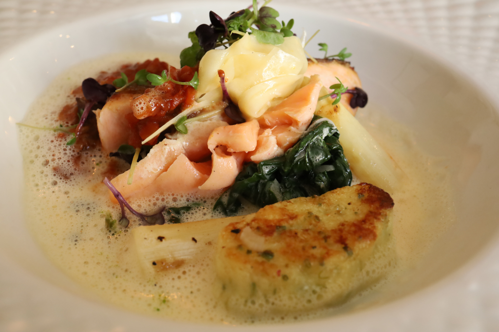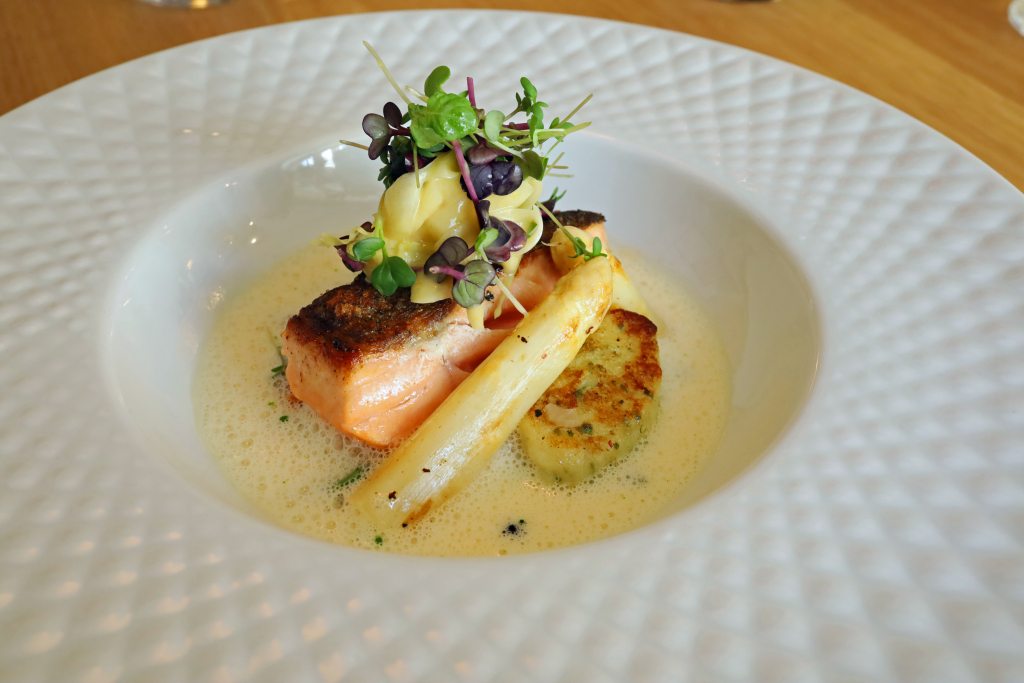 Der Lachs war schlichtweg perfekt gegart: auf der Haut knusprig gebraten, darunter saftig und mit leicht glasigem Kern, der Qualität und Präzision sofort erkennen lässt. Ein Produkt, das mit Ruhe und Selbstverständlichkeit präsentiert wird.