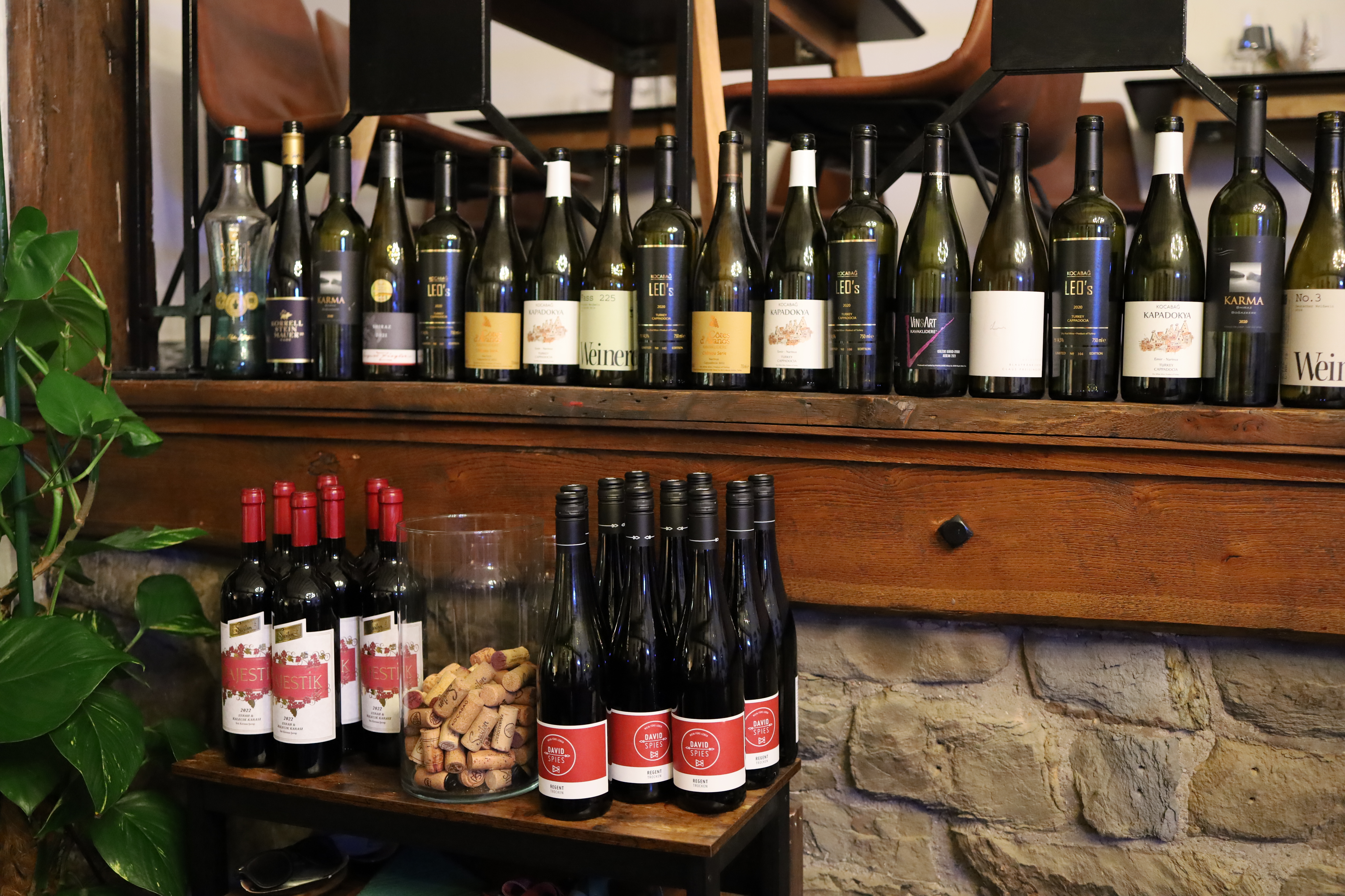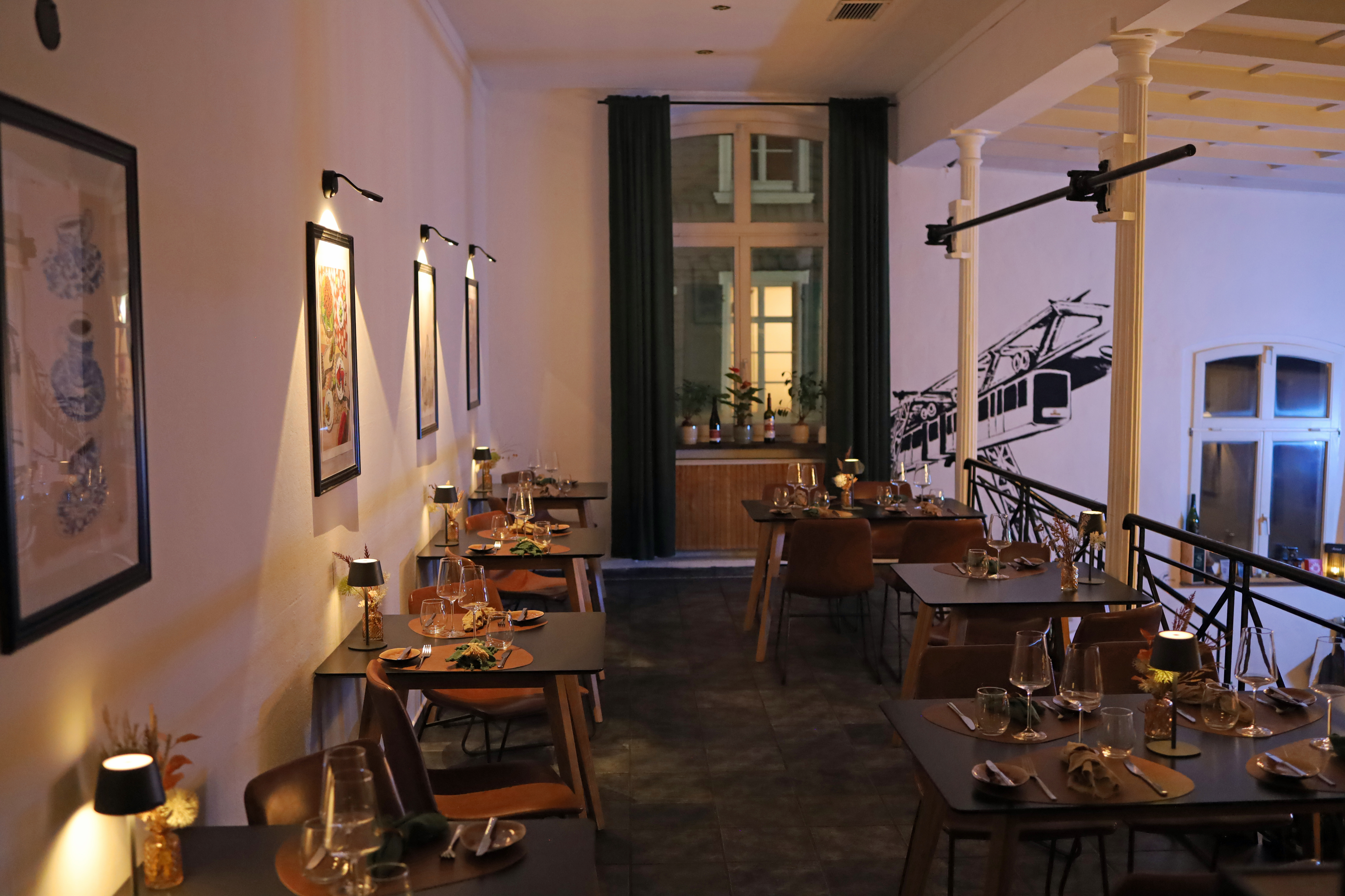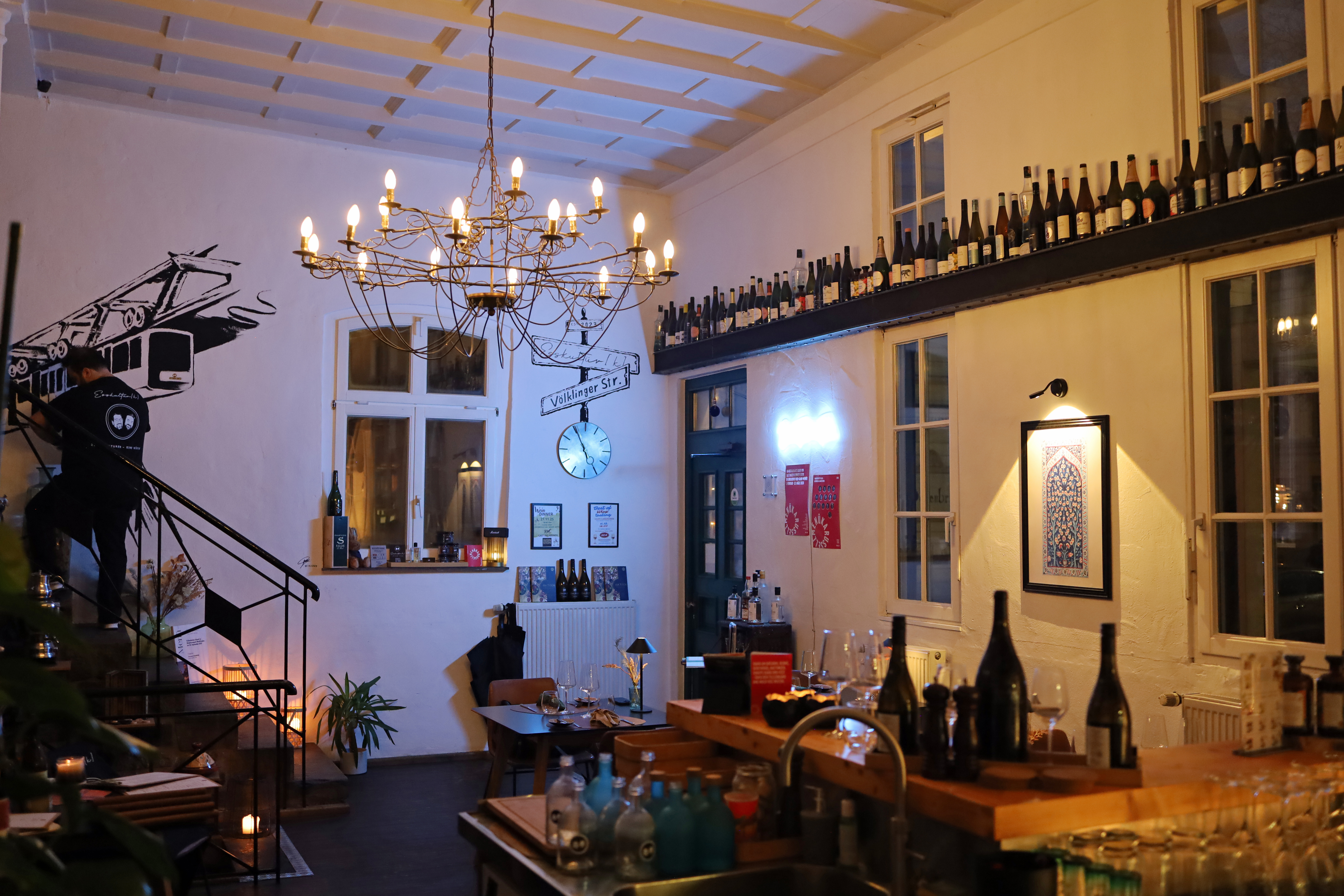 Gestalterisch verbindet sich hier eine gewisse urbane Klarheit mit einer sehr persönlichen Handschrift. Freigelegte Elemente, warme Lichtführung, eine lebendige Bilderwand, dazu die Weinflaschen entlang der Empore – das wirkt nicht inszeniert, sondern gewachsen. Auch der leicht verspielte Kronleuchter fügt sich überraschend selbstverständlich ein.