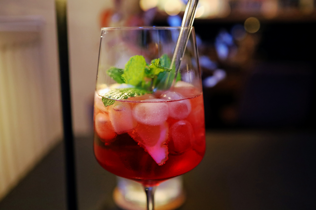 Der hauseigene „Kultur[k] Spritz“ bringt Granatapfel, Prosecco, Limette und Minze zusammen – eine Kombination, die sofort zugänglich ist.