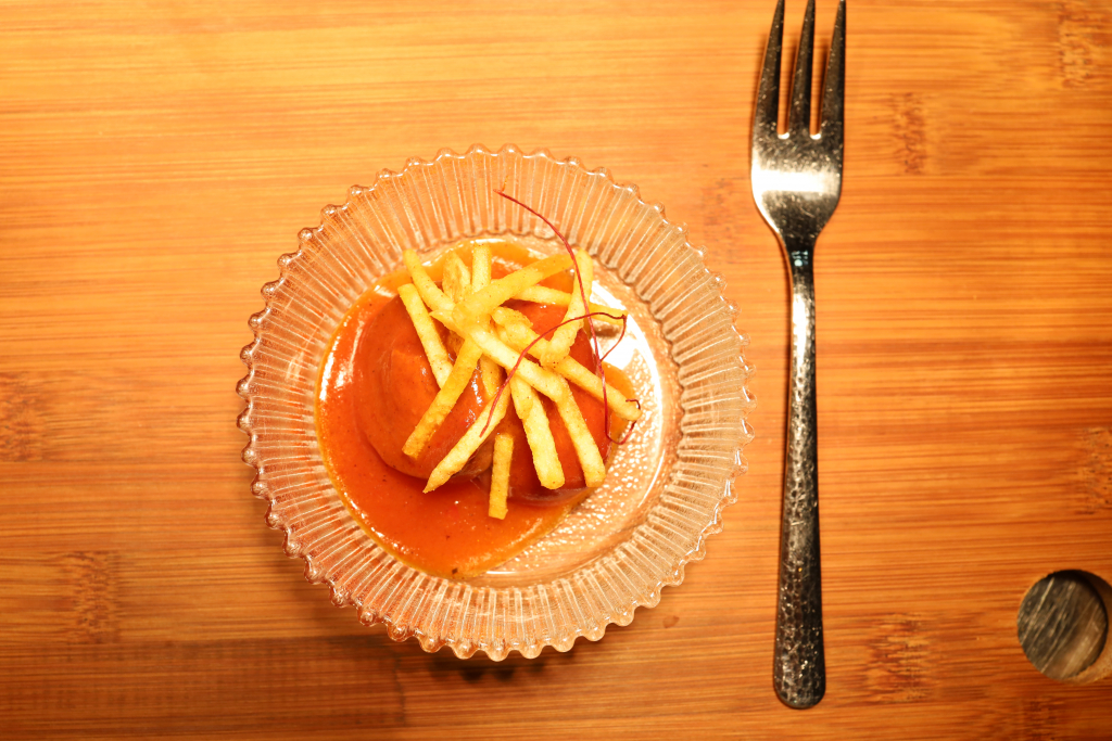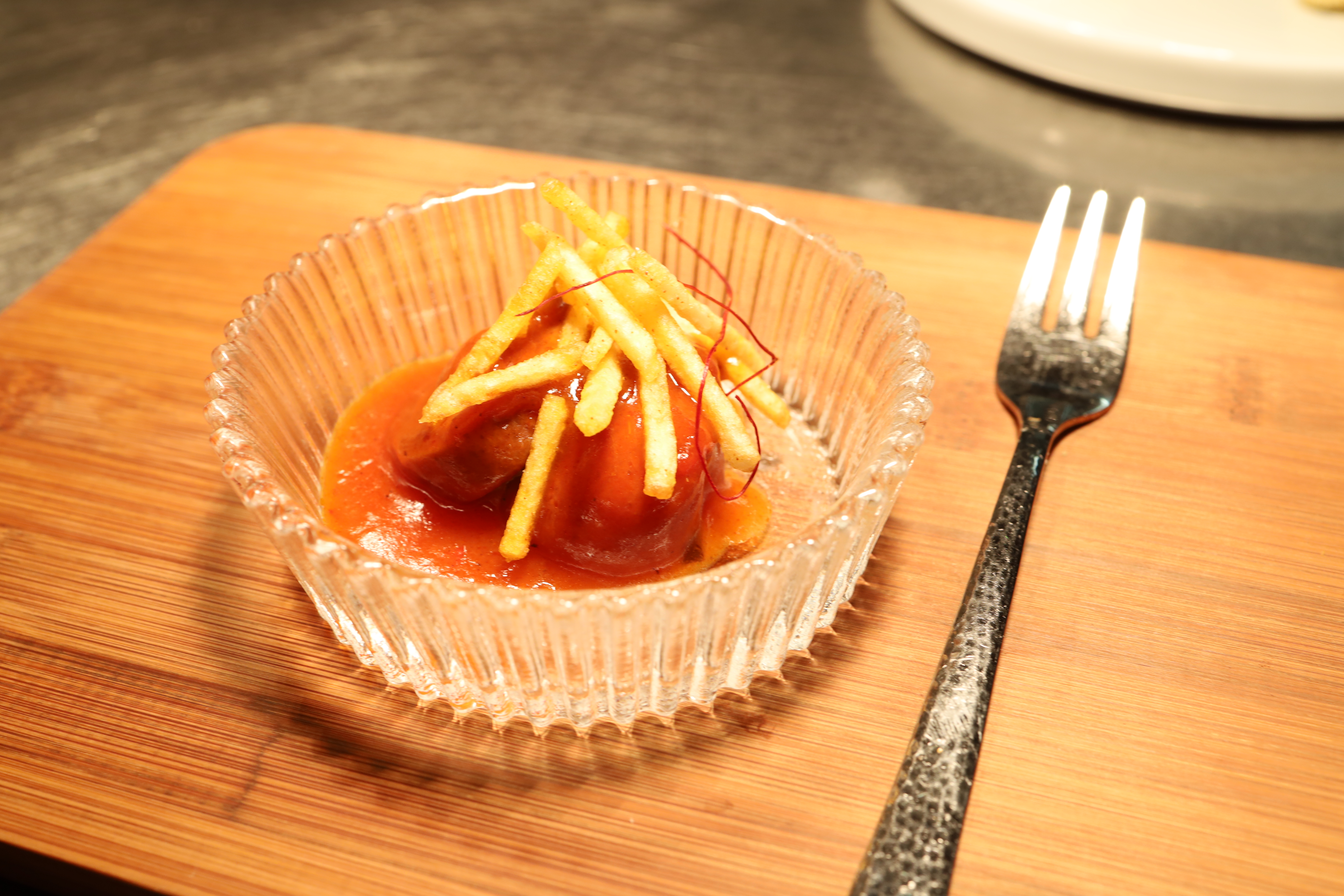 Zum Auftakt kommt ein Amuse, das augenzwinkernd mit einem vertrauten Motiv spielt: Sucuk, interpretiert als kleine „Currywurst“. Dazu eine fruchtige, leicht süßlich geführte Sauce und feine Pommes allumettes – eher Streichholz als klassische Pommes.