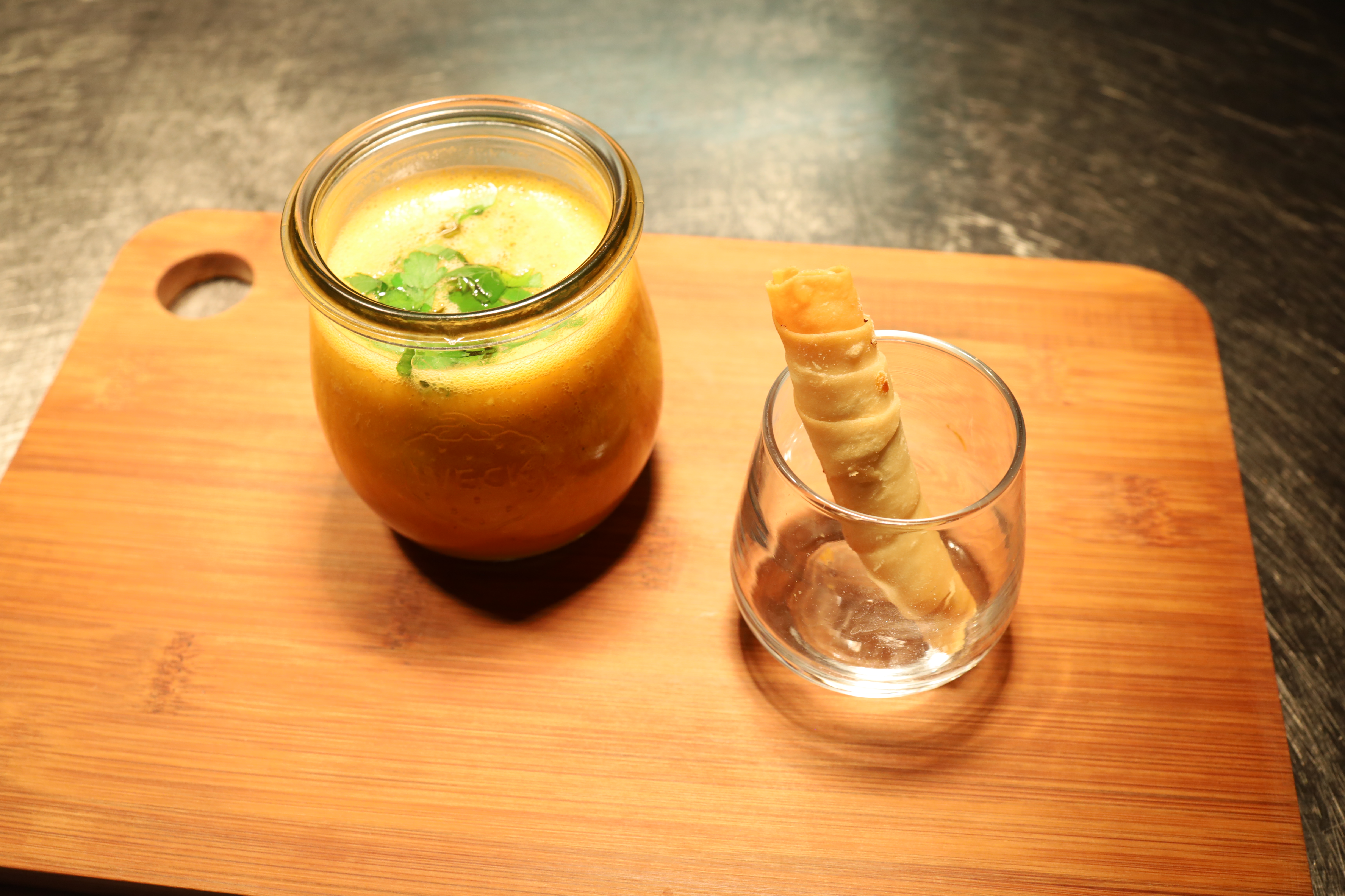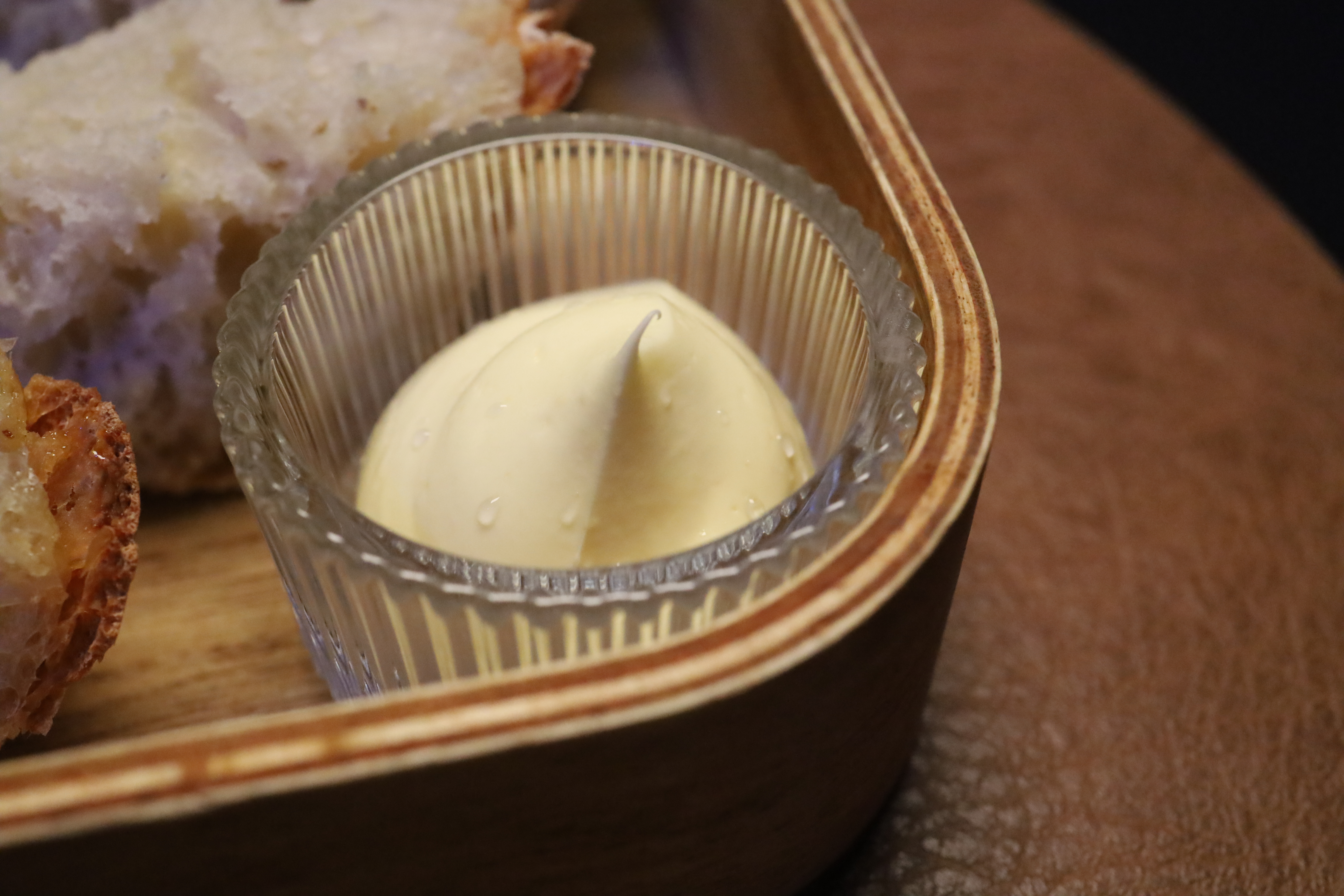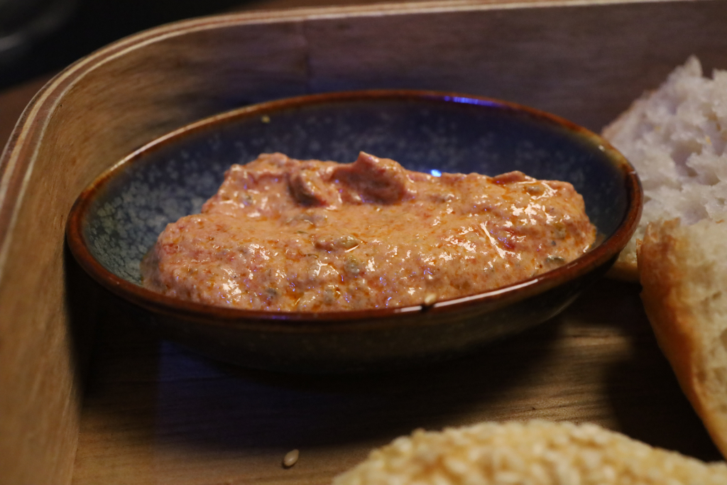 Dazu eine geschlagene Salzbutter, luftig, fast schon mousseartig, mit angenehmer Balance sowie eine tomaten-paprikabasierte Creme mit feiner Knoblauchnote.