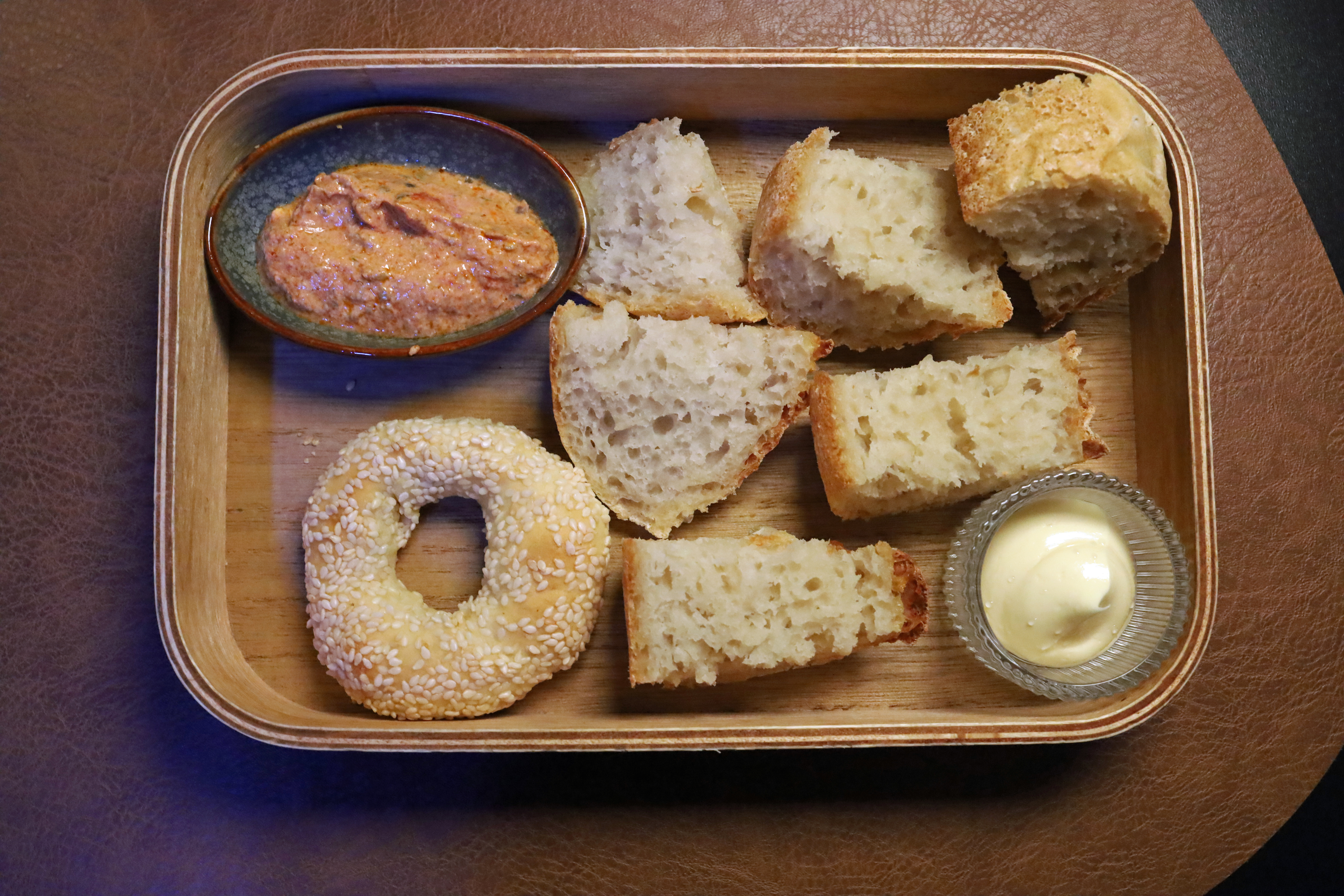 Danach das Brot – und auch hier wird es interessant. Statt eines einzelnen Laibs kommt eine kleine Vielfalt auf den Tisch: unterschiedliche Texturen, ergänzt durch einen Sesamring, alles hausgemacht.