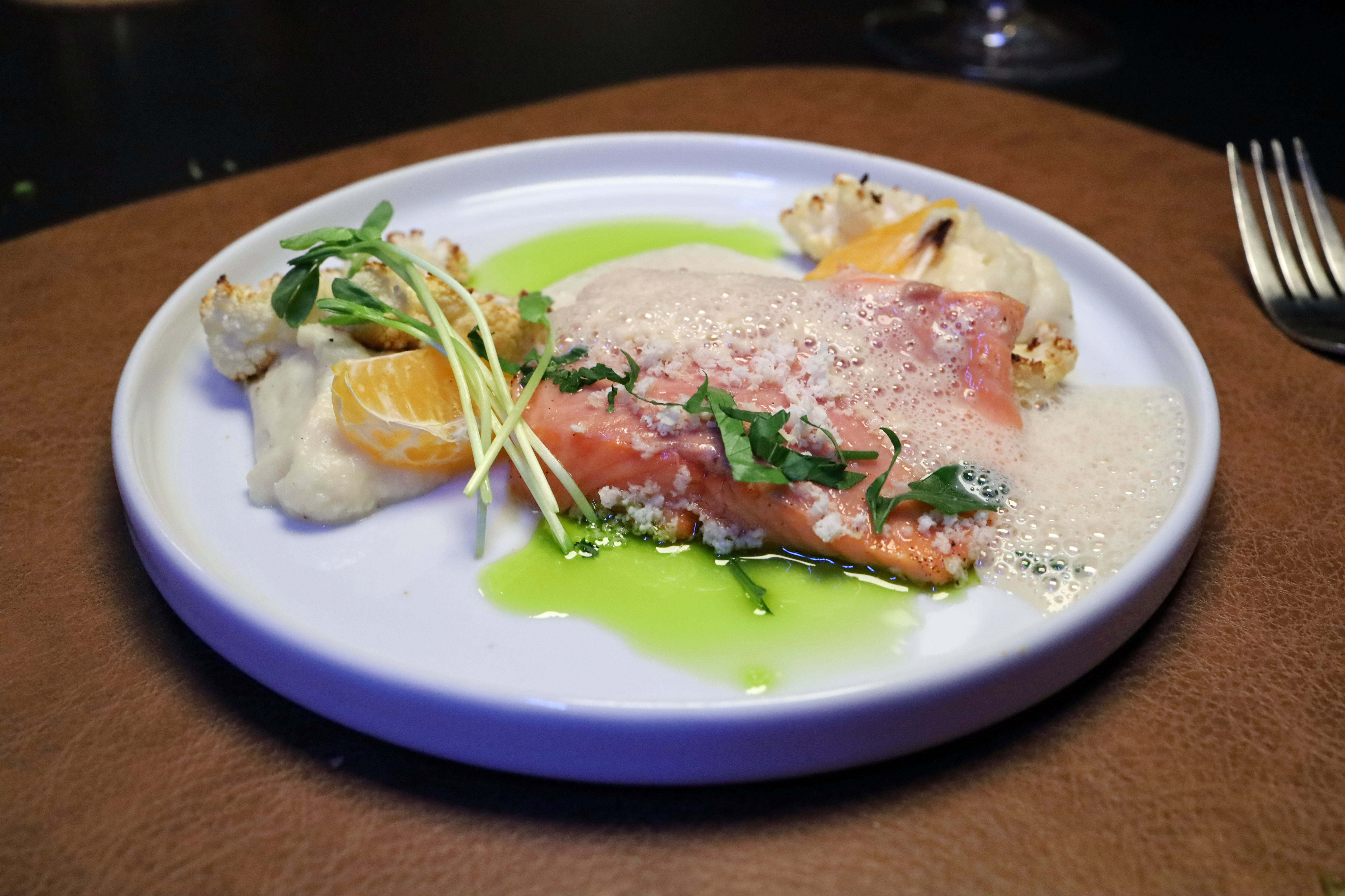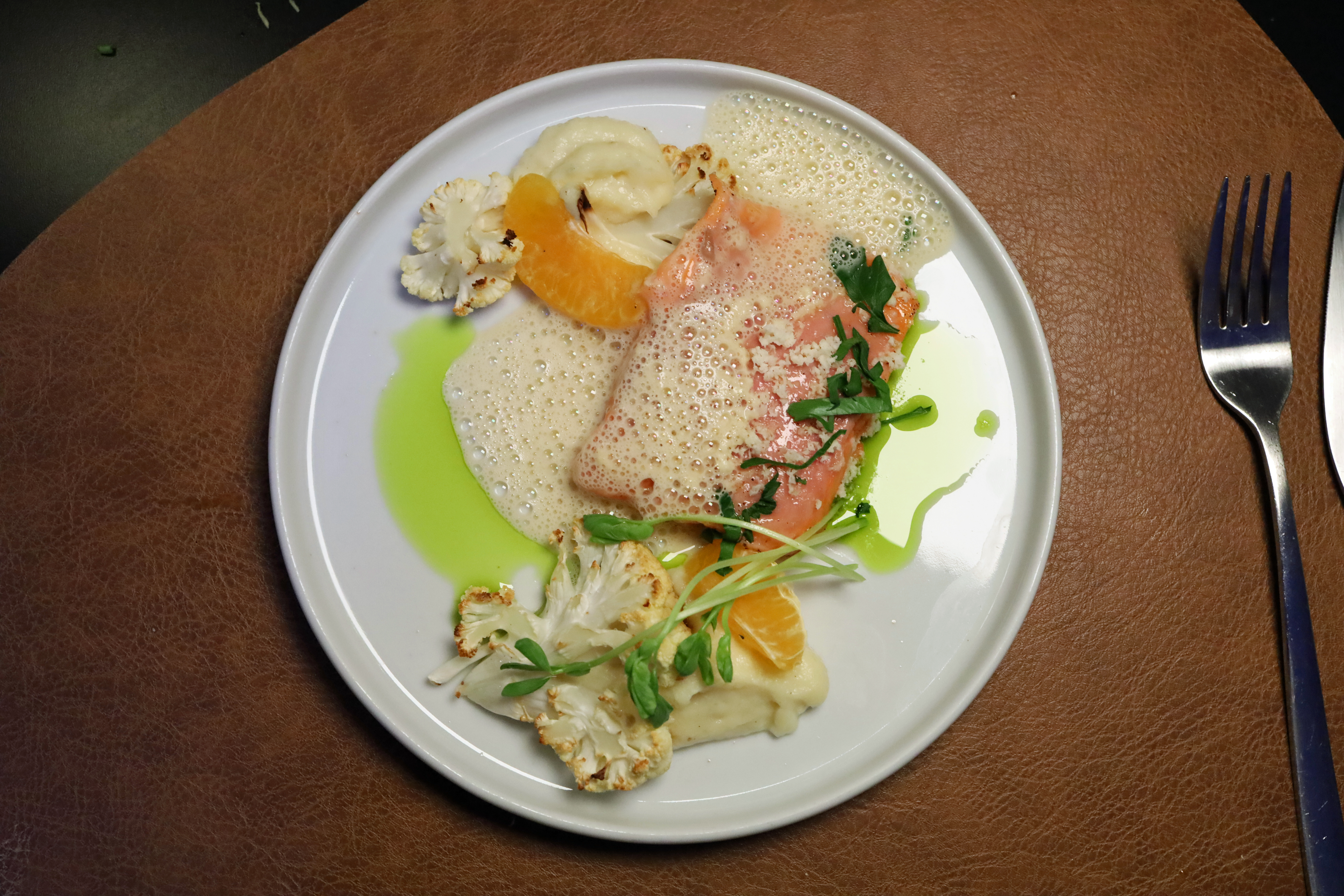 Die Komposition bleibt dabei klar und übersichtlich: Blumenkohl, Mandarine und Meerrettich bilden das Gerüst, auf dem sich der Fisch entfaltet. Die Lachsforelle selbst sauber gegart, glasig im Kern, mit einer feinen, natürlichen Saftigkeit.