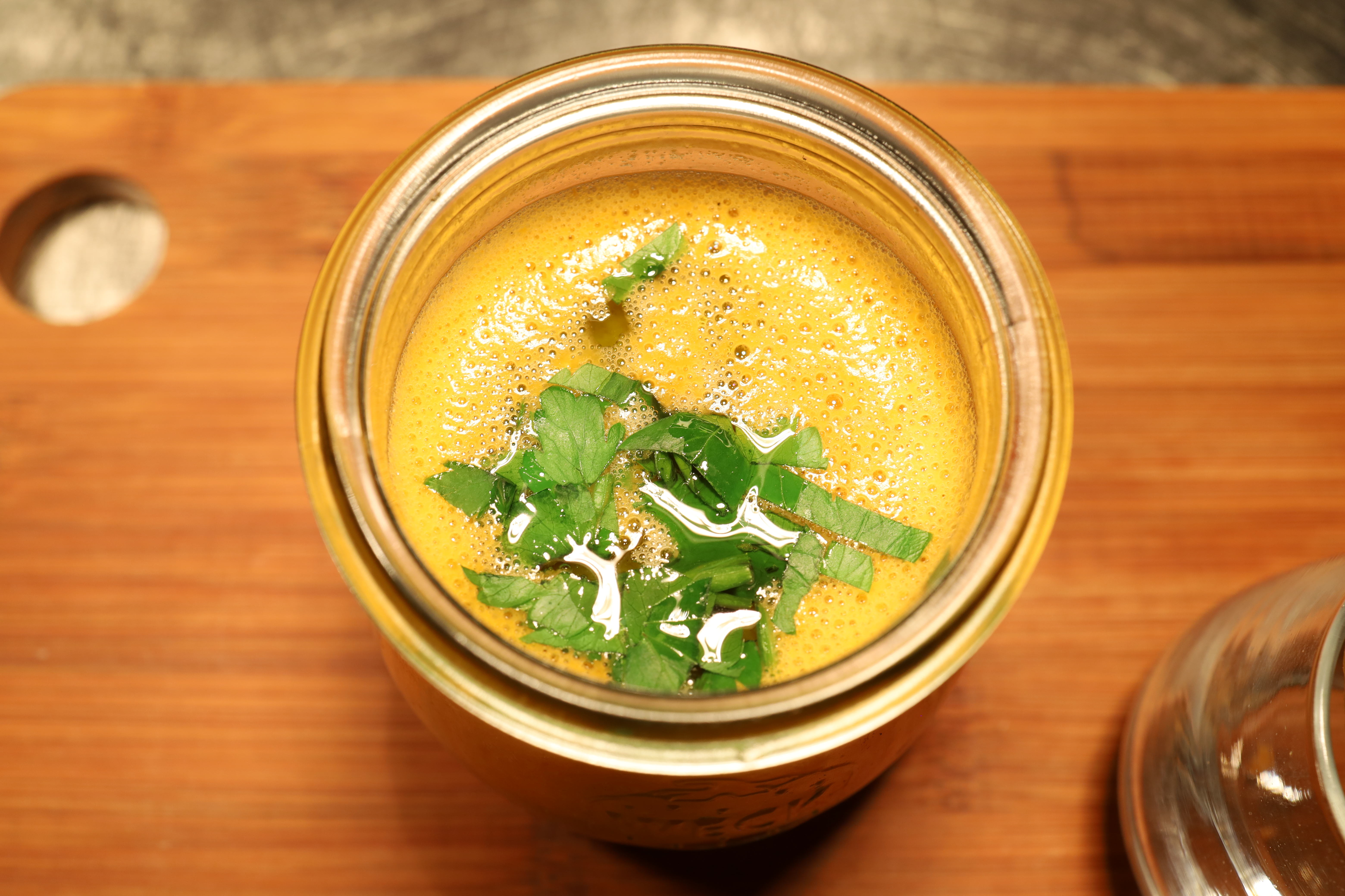 Die Suppe zeigt sich so, wie man sie sich wünscht: fein püriert, mit einer leicht erdigen Tiefe aus der Linse, dazu eine angenehme Würze, die trägt. Die Konsistenz ausgewogen, weder zu dick noch zu flüssig, mit einer schönen, fast samtigen Textur.