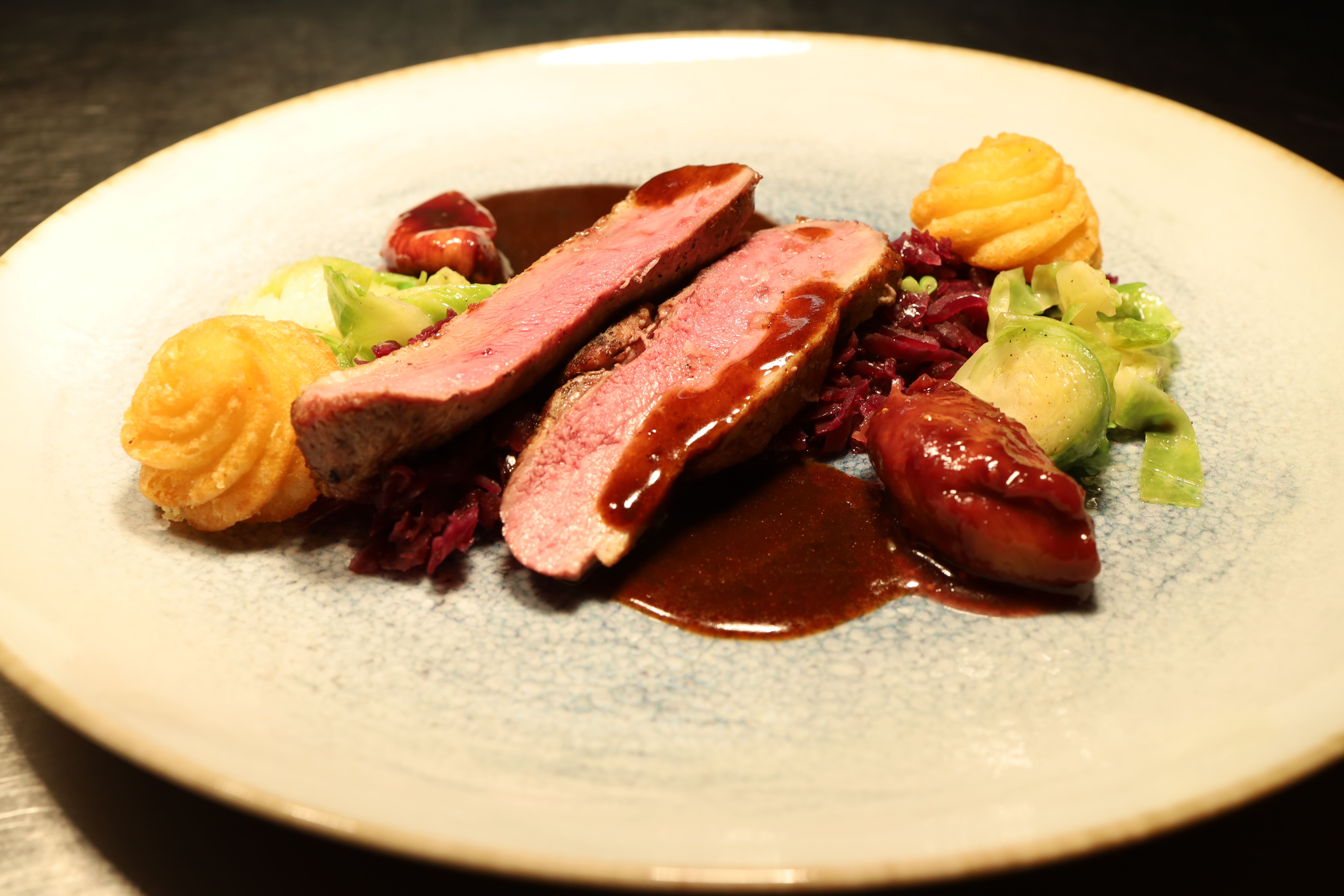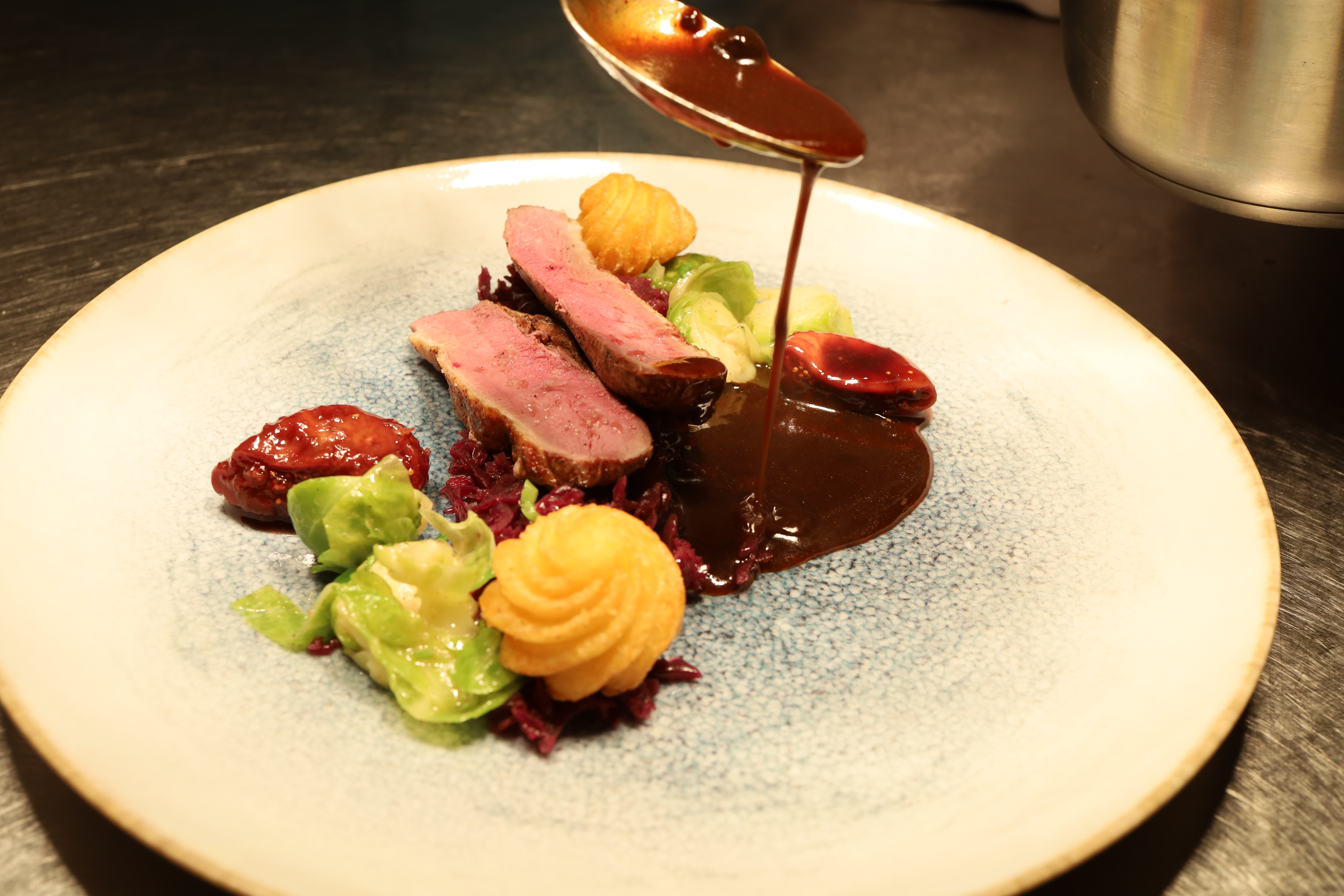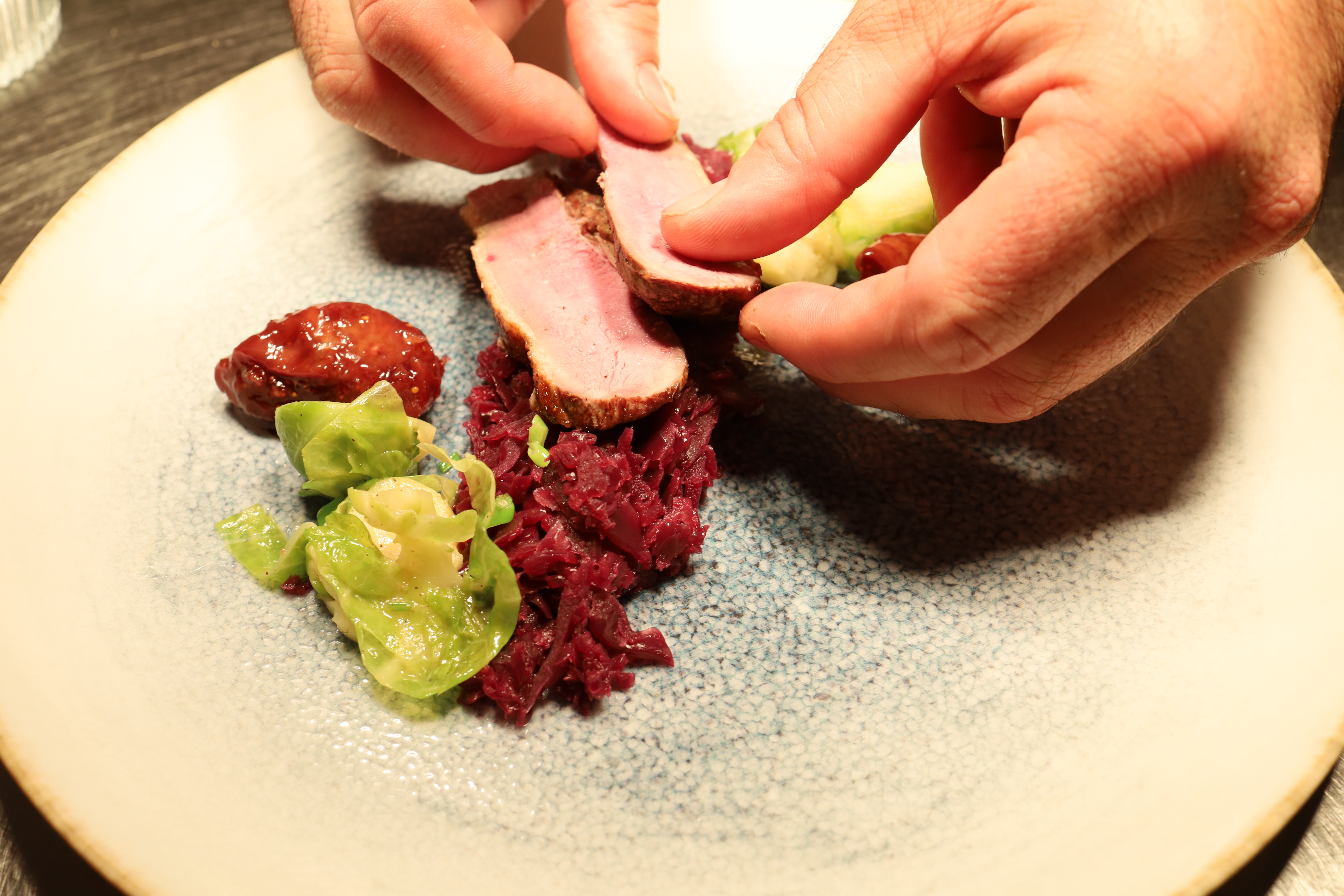 Darauf aufbauend setzen die weiteren Komponenten ihre Akzente: Rosenkohl, leicht gebunden, mit einer frischen, dezent herben Note, die dem Gericht Spannung verleiht, während die Feige eine dunklere, fruchtige Süße einbringt, die sich sehr natürlich in das Gesamtbild einfügt und den Bogen zum Jus schlägt.