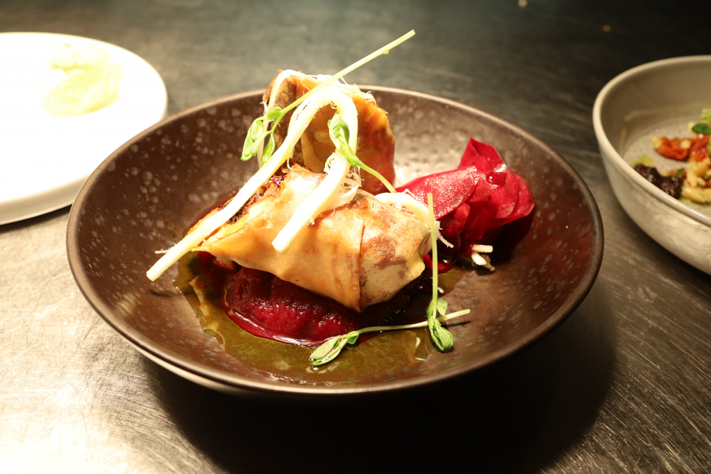 Ein Pastinakenstrudel, den ich selbst nicht probiert habe, zeigte sich am Pass als sehr klar gesetzter, fast grafisch wirkender Teller. Die Hülle knusprig ausgebacken, das Innere entsprechend wohl weich und erdig gedacht, getragen von der Pastinake.