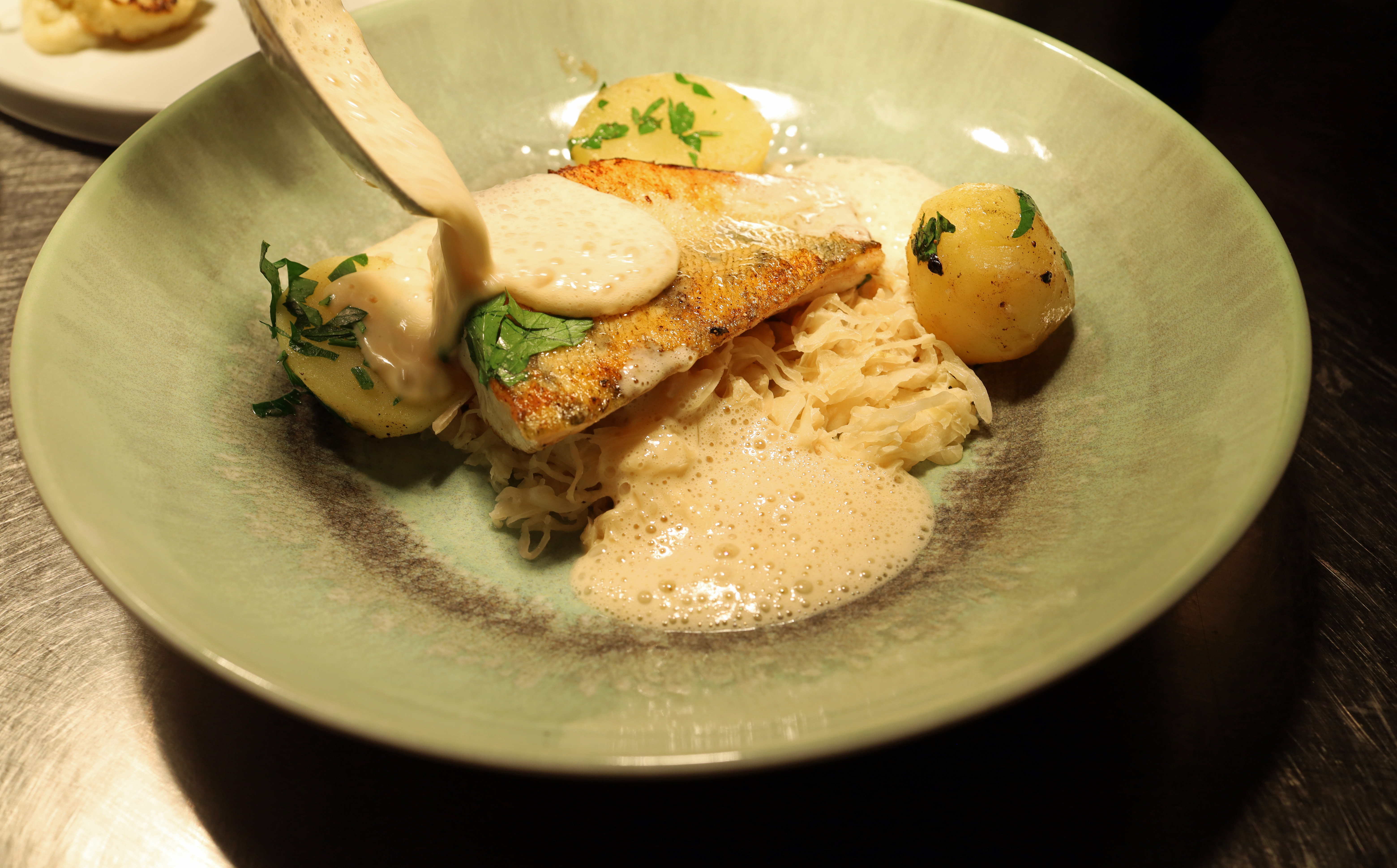 Der Weißweinschaum wirkt dabei wie ein ausgleichendes Element – leicht, eher elegant geführt, um die Säure des Sauerkrauts aufzufangen und das Gericht zusammenzuhalten. Kein Spiel mit Kontrasten, sondern ein ruhig gedachtes, handwerklich sicheres Arrangement.