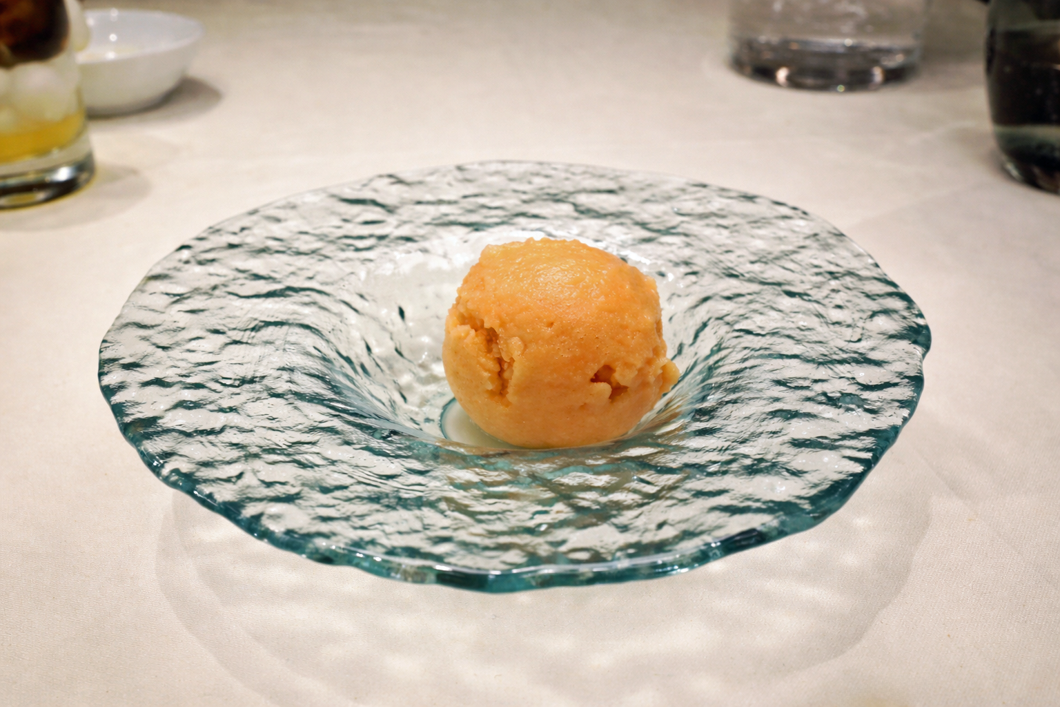 Ein Campari-Sorbet markiert den Übergang. Hausgemacht, sauber gearbeitet, auch ohne Pacojet frei von Kristallbildung. Entscheidend ist die Balance: nicht süßlich, nicht gefällig, sondern angenehm herb und leicht bitter – so, wie man es sich wünscht und wie man es bei industriell hergestellten Sorbets dieser Art oft vermisst, da diese mir oft zu süß geraten.