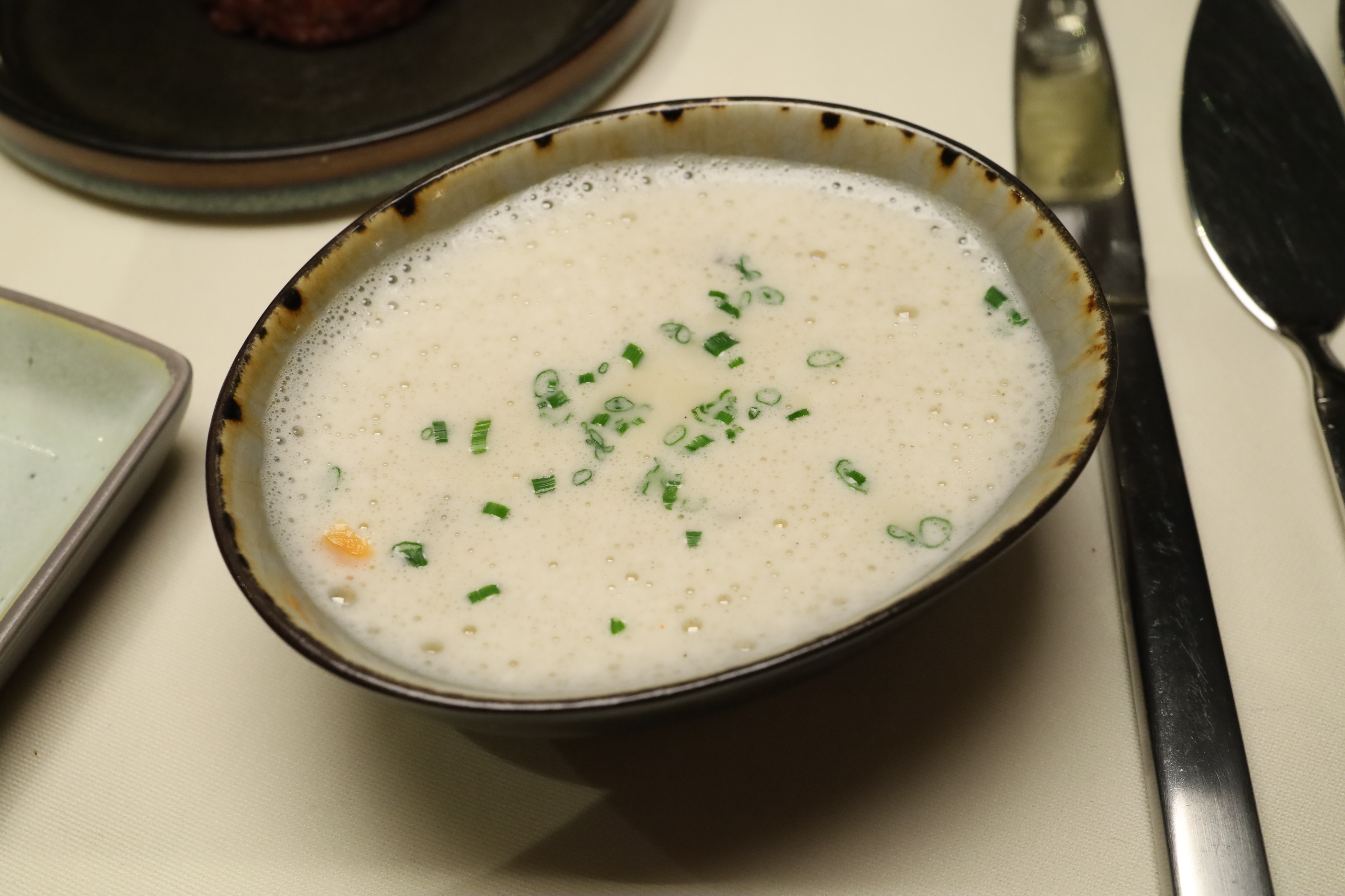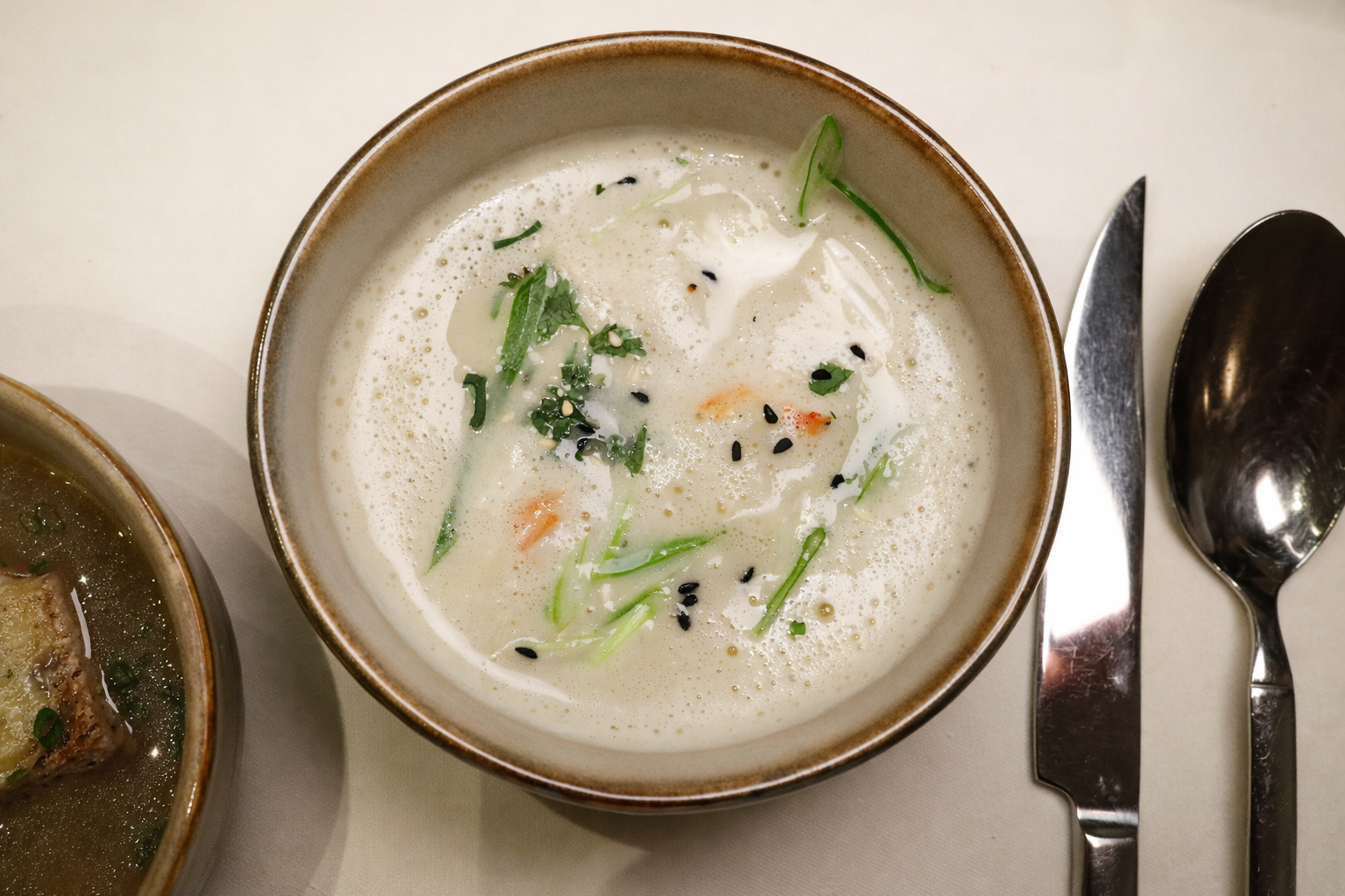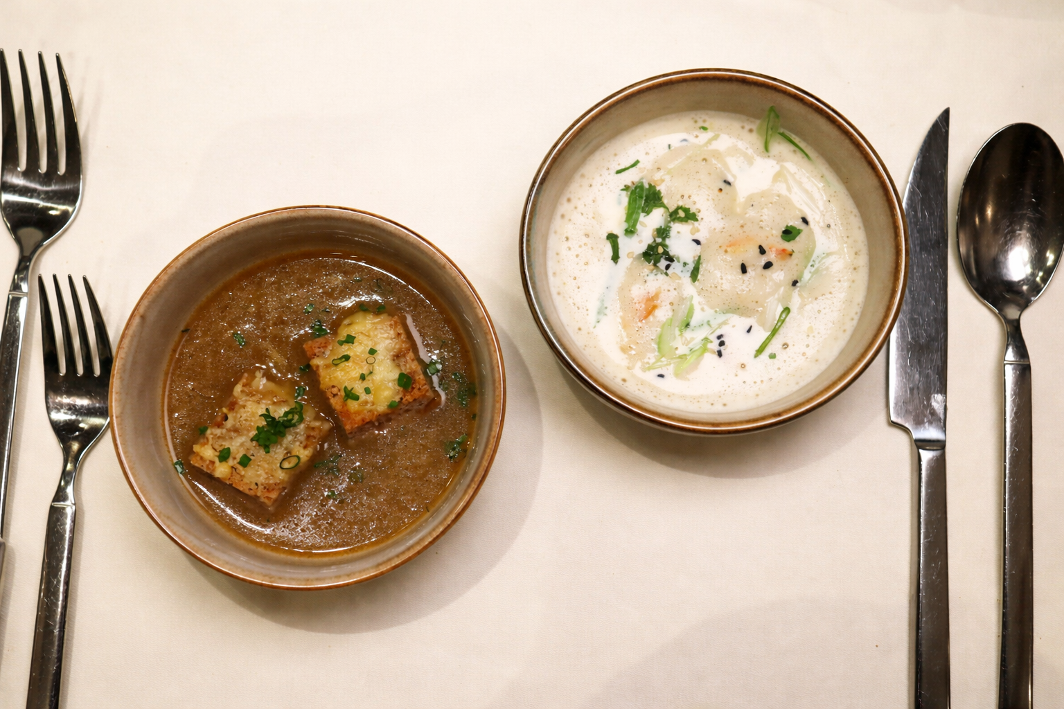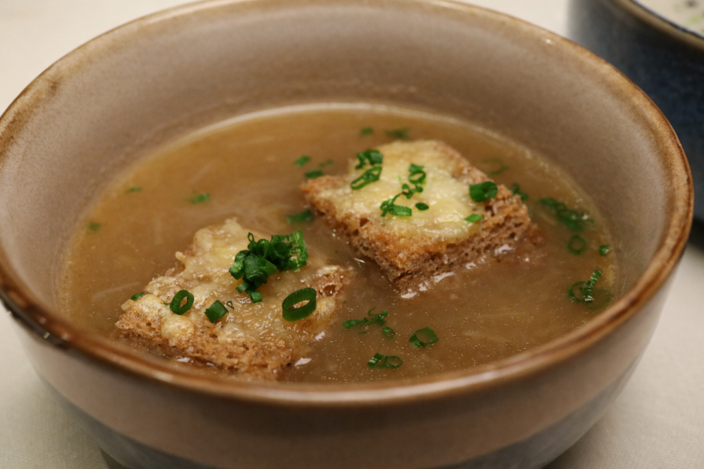 Wenig später werden zwei Suppen gereicht, auf meinen Wunsch kam die Zwiebelsuppe noch dazu.