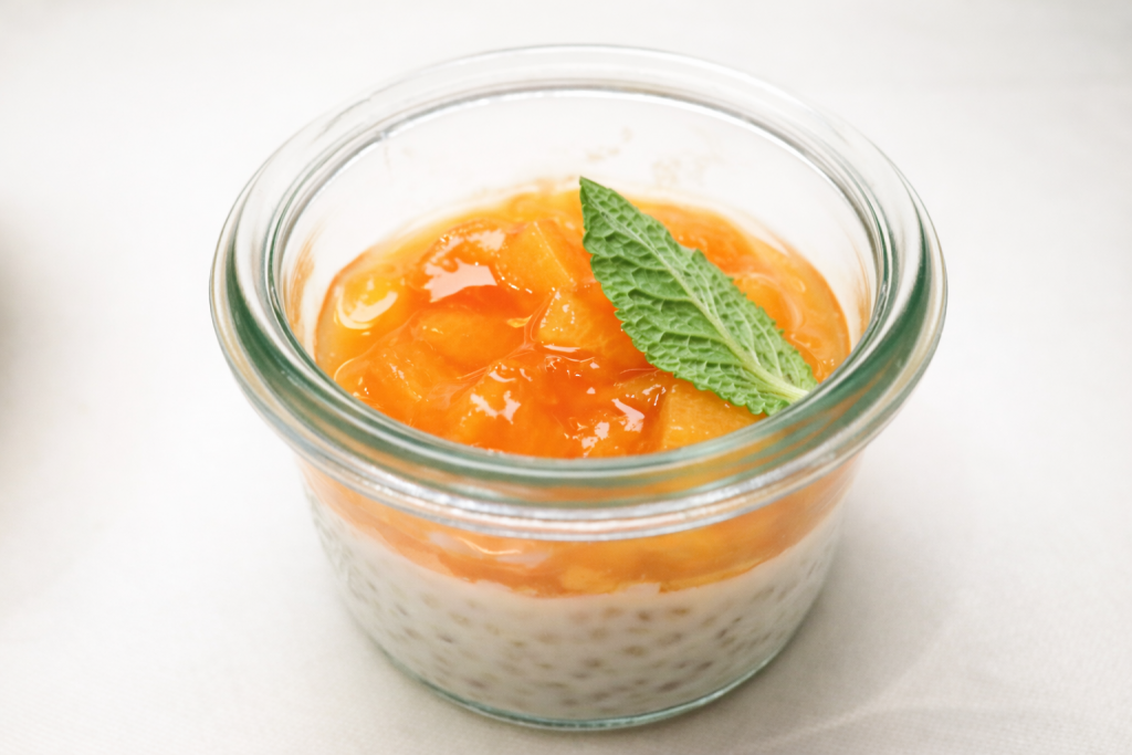 Daneben ein Quinoa-Kokos-Pudding mit Papaya-Vanilleragout. Deutlich ruhiger angelegt, mit feiner, zurückhaltender Süße und einer angenehmen Leichtigkeit. Die Quinoa bleibt spürbar, ohne sich aufzudrängen, während die Papaya eine weiche, natürliche Fruchtigkeit einbringt.