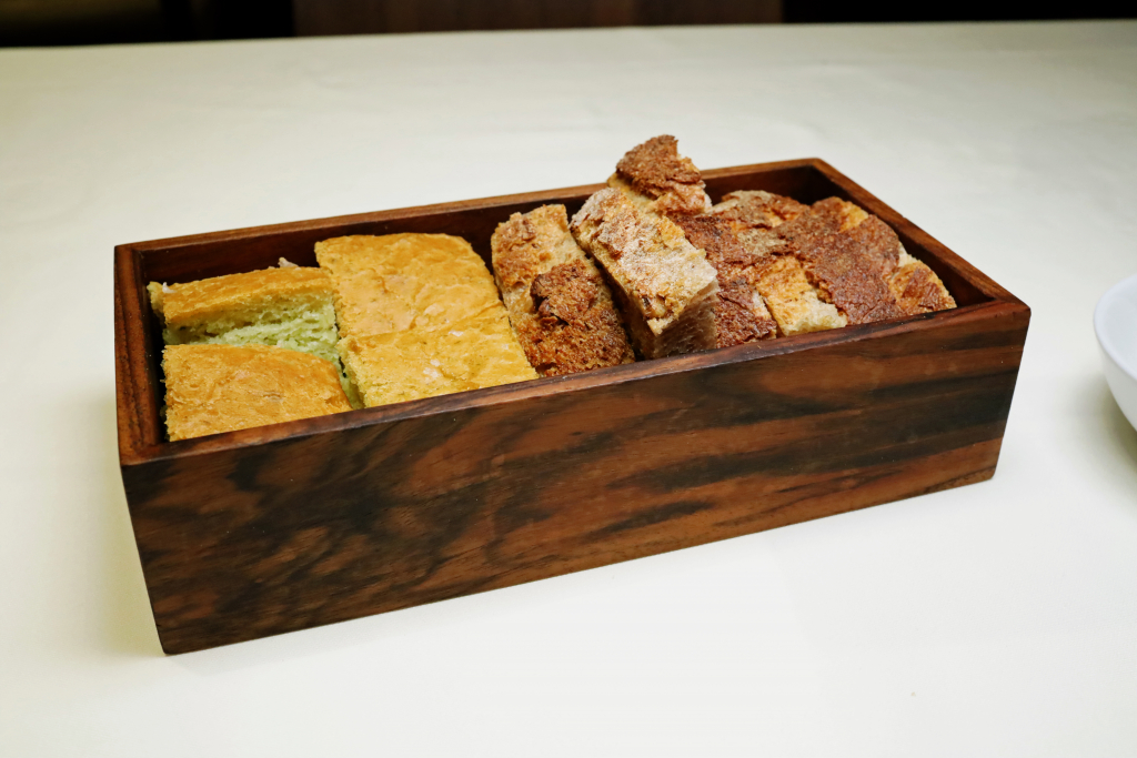 Noch vor dem eigentlichen Menü kommt Brot auf den Tisch, nahezu parallel zum Amuse. Dreierlei Brot, handwerklich präzise gebacken: eine klassische helle Variante, ein kräftigeres dunkles Brot und ein Brot mit feinem Jalapeño-Einfluss, dessen grünlicher Ton bereits optisch auffällt.