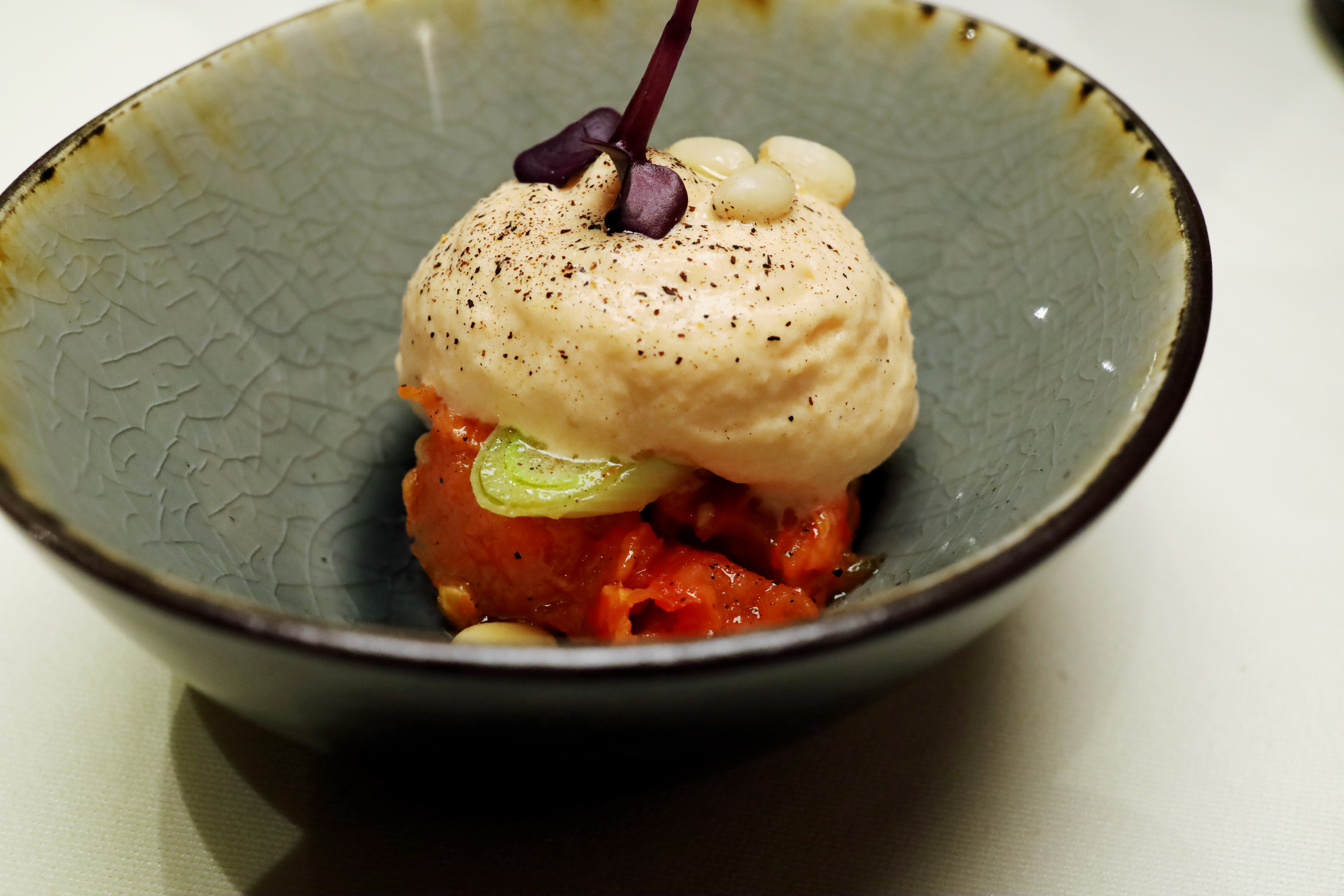 Das Amuse setzt genau hier an. Ein feiner Tomaten-Espuma ruht auf einem aromatischen Tomaten-Lauch-Salat, darüber Kresse. Die Tomate steht klar im Mittelpunkt: frisch, präzise, ohne Süße, ohne Säureüberhang. Der Lauch gibt vegetabile Tiefe, die Kresse setzt einen leichten, grünen Akzent.