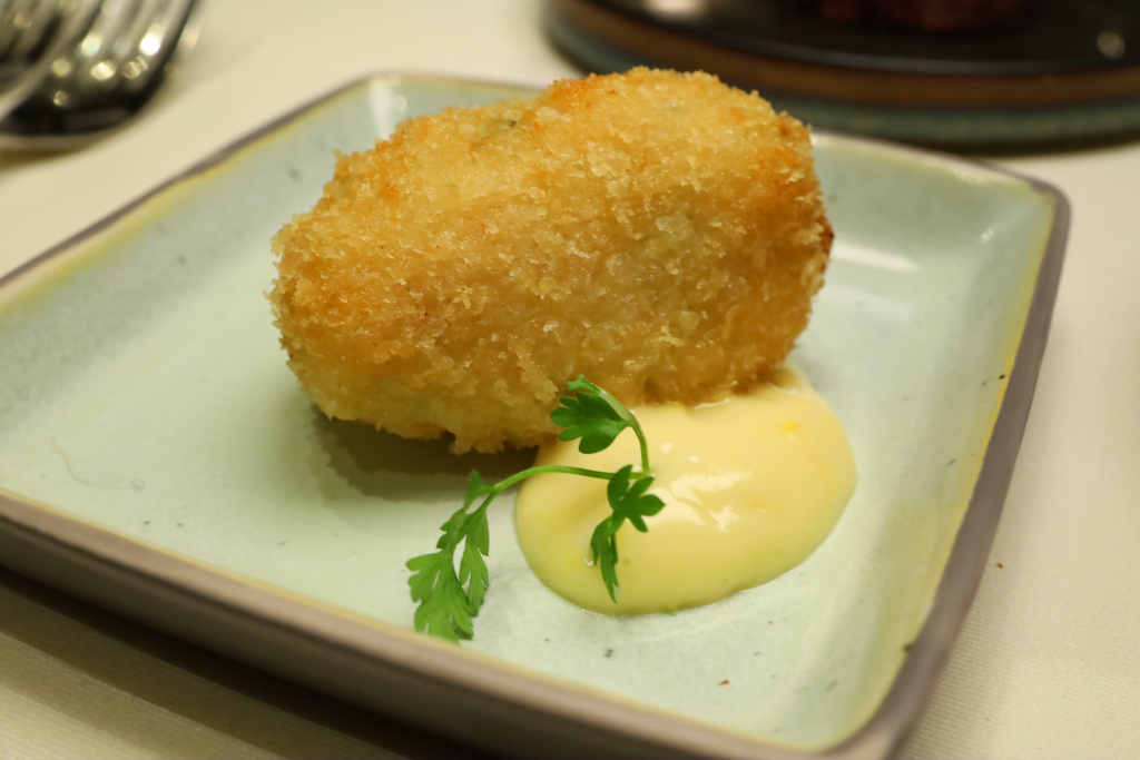 Die Garnelenkrokette erinnert klar an die Croquetas der spanischen Tapas-Welt: außen knusprig, innen cremig, sauber gearbeitet. Begleitet wird sie von einer leichten Limetten-Aioli, die Frische bringt, ohne das Garnelenaroma zu überdecken.