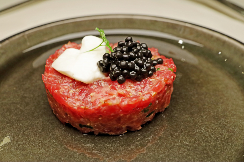 Daneben ein Tatar, klassisch geschnitten und präzise gewürzt, ergänzt durch Schmand und etwas Kaviar. Nicht als Luxusgeste, sondern als gezielt gesetzter Akzent für Salzigkeit und Tiefe.