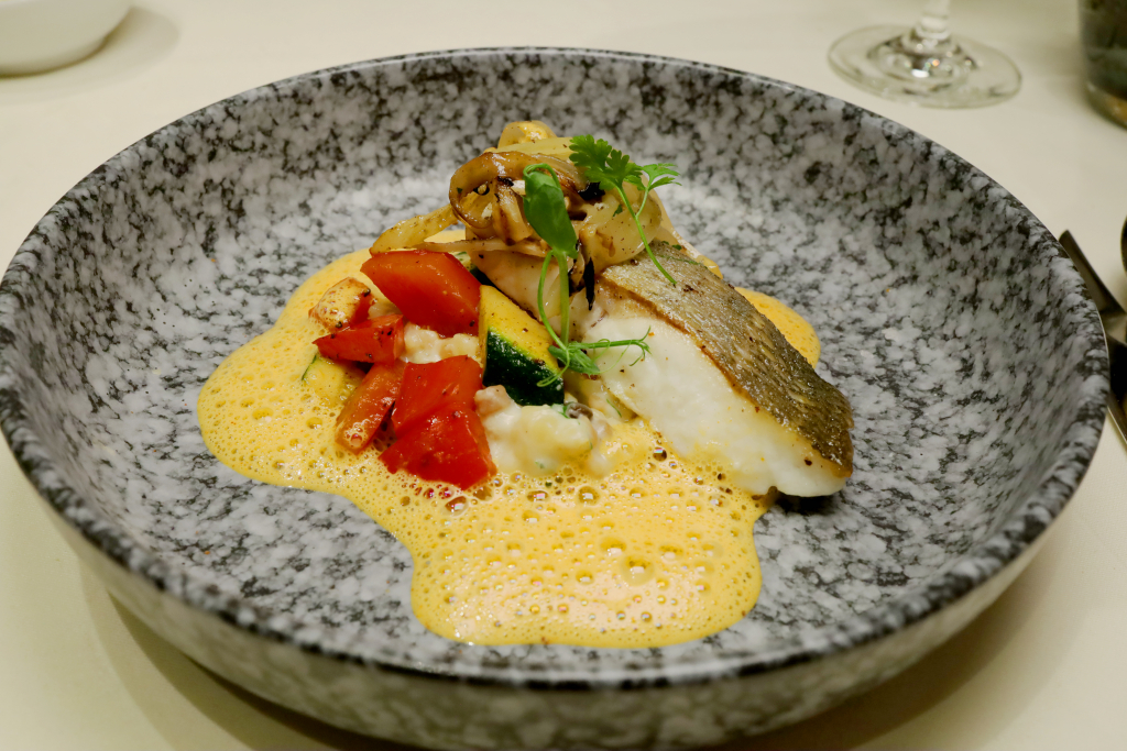 Das verbindende Element ist eine geschäumte Beurre blanc, aromatisiert mit Pimentón de la Vera. Fein dosiert, sehr ausgewogen abgeschmeckt, mit schöner Spannung zwischen Butter, Säure und Rauch. Ein klassischer, sehr stimmiger Fischgang.
