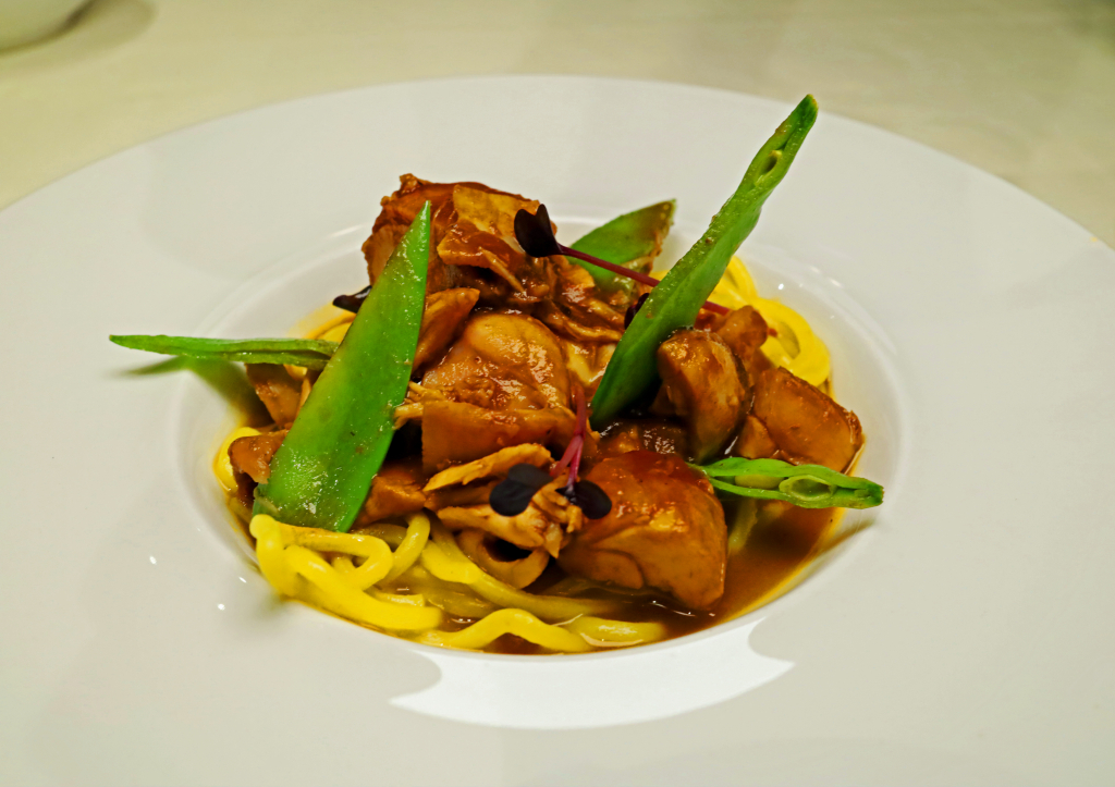 Auf meinen persönlichen Wunsch folgt ein Zwischengang aus Menü 1: Kaninchenragout mit Cognac, hausgemachten Spaghetti und Kaiserschoten.