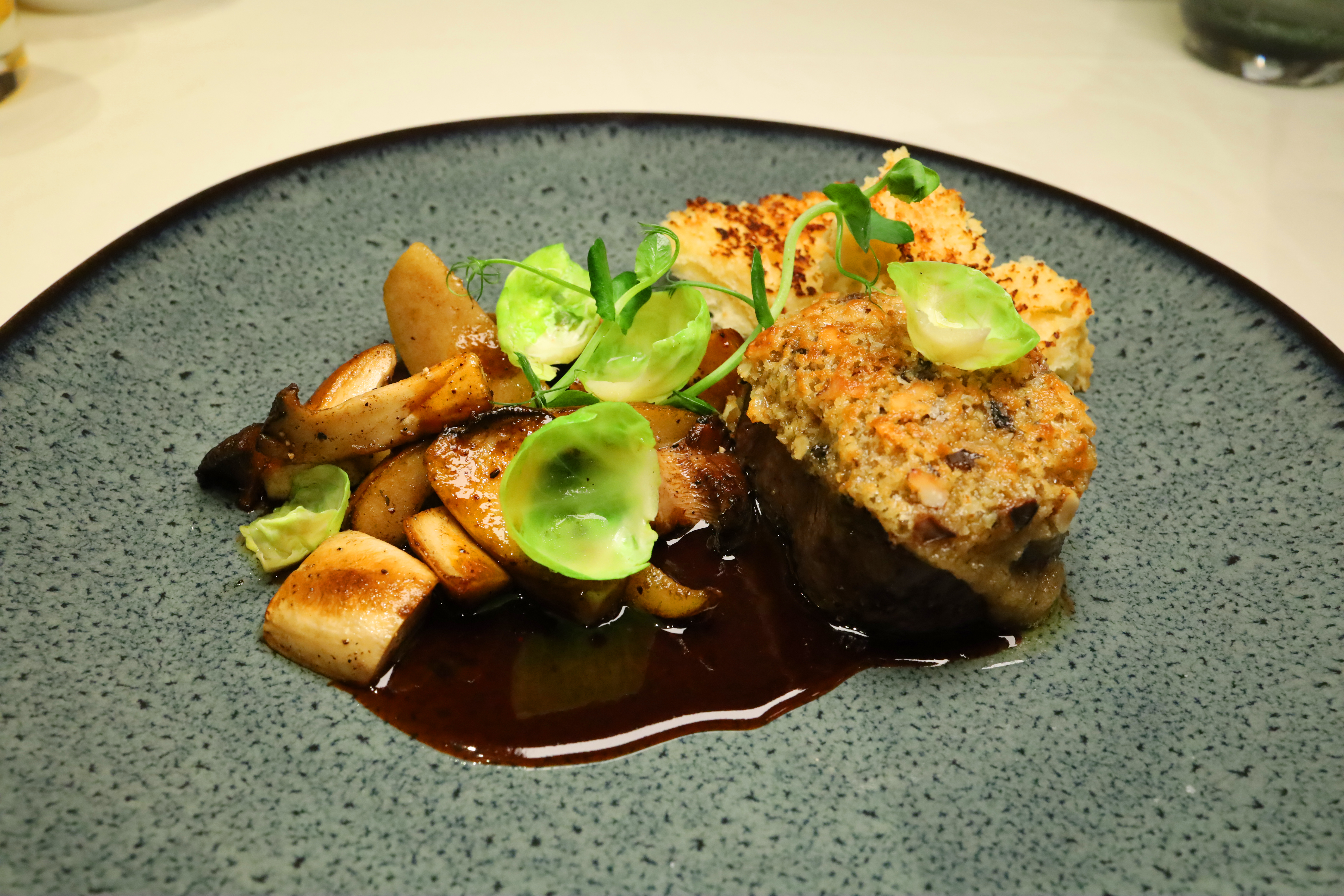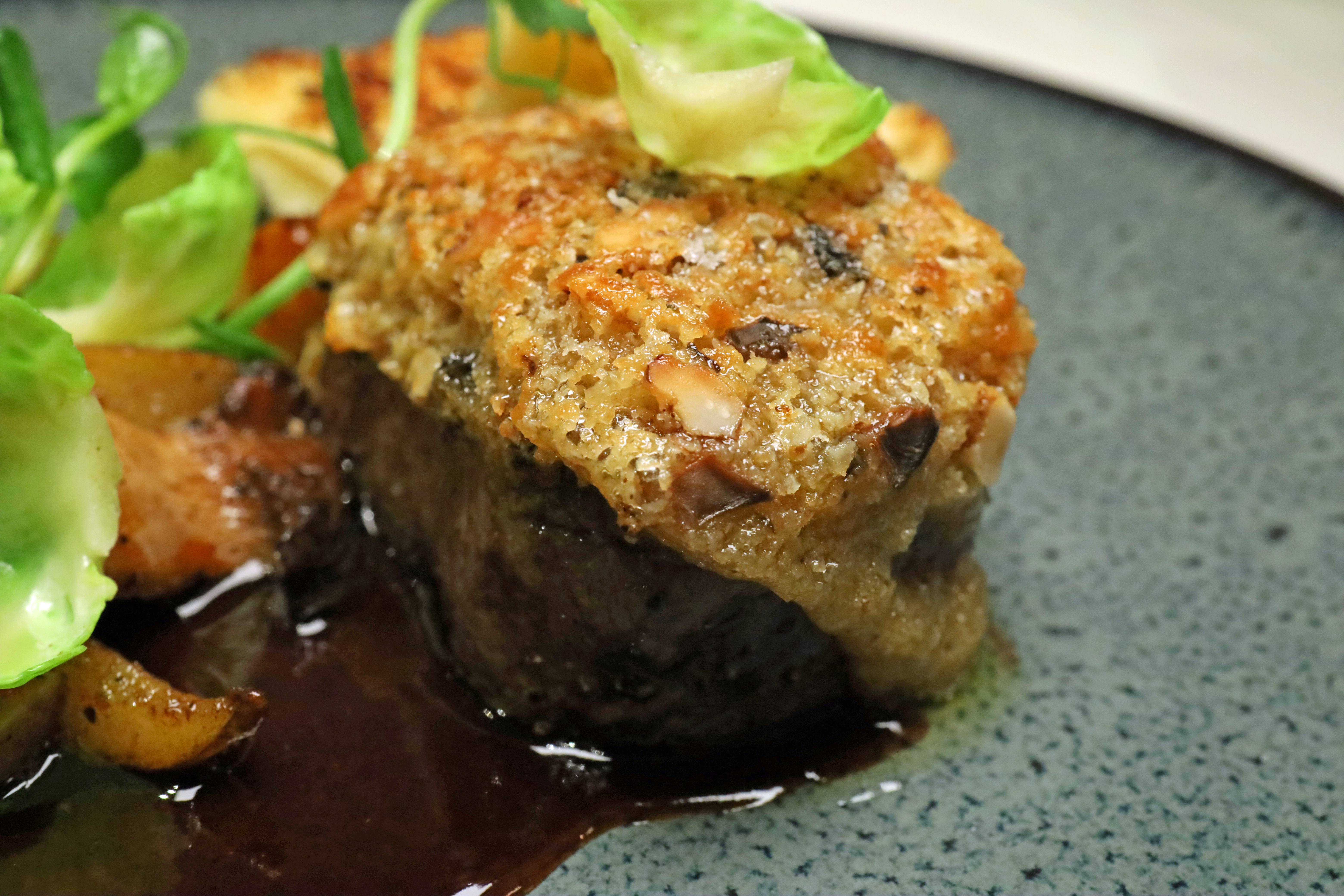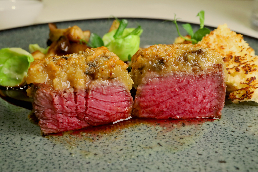 Das Fleisch stammt aus regionaler Jagd und ist handwerklich exzellent gegart: saftig, feinfasrig und von natürlicher Tiefe im Geschmack. Die Walnusskruste bringt Textur und eine warme, nussige Note ein, ohne sich in den Vordergrund zu drängen.