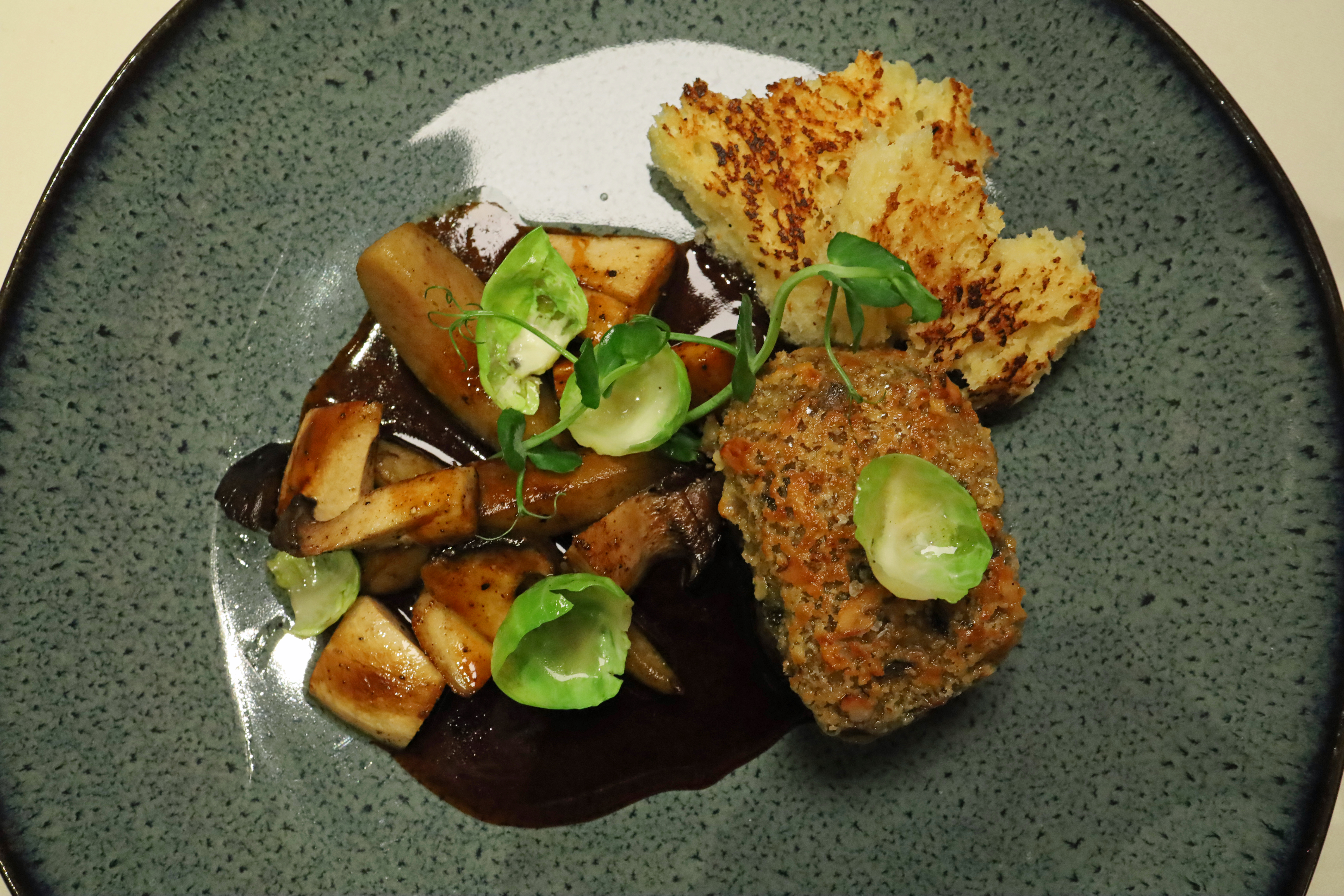 Der Wintergewürzjus ist dicht und kraftvoll, dabei klar strukturiert und präzise geführt. Schmorbirne, Saitlinge und Rosenkohl greifen die herbstliche Aromatik stimmig auf, während das Brioche als weicher, buttriger Begleiter dient und den Jus dankbar aufnimmt.