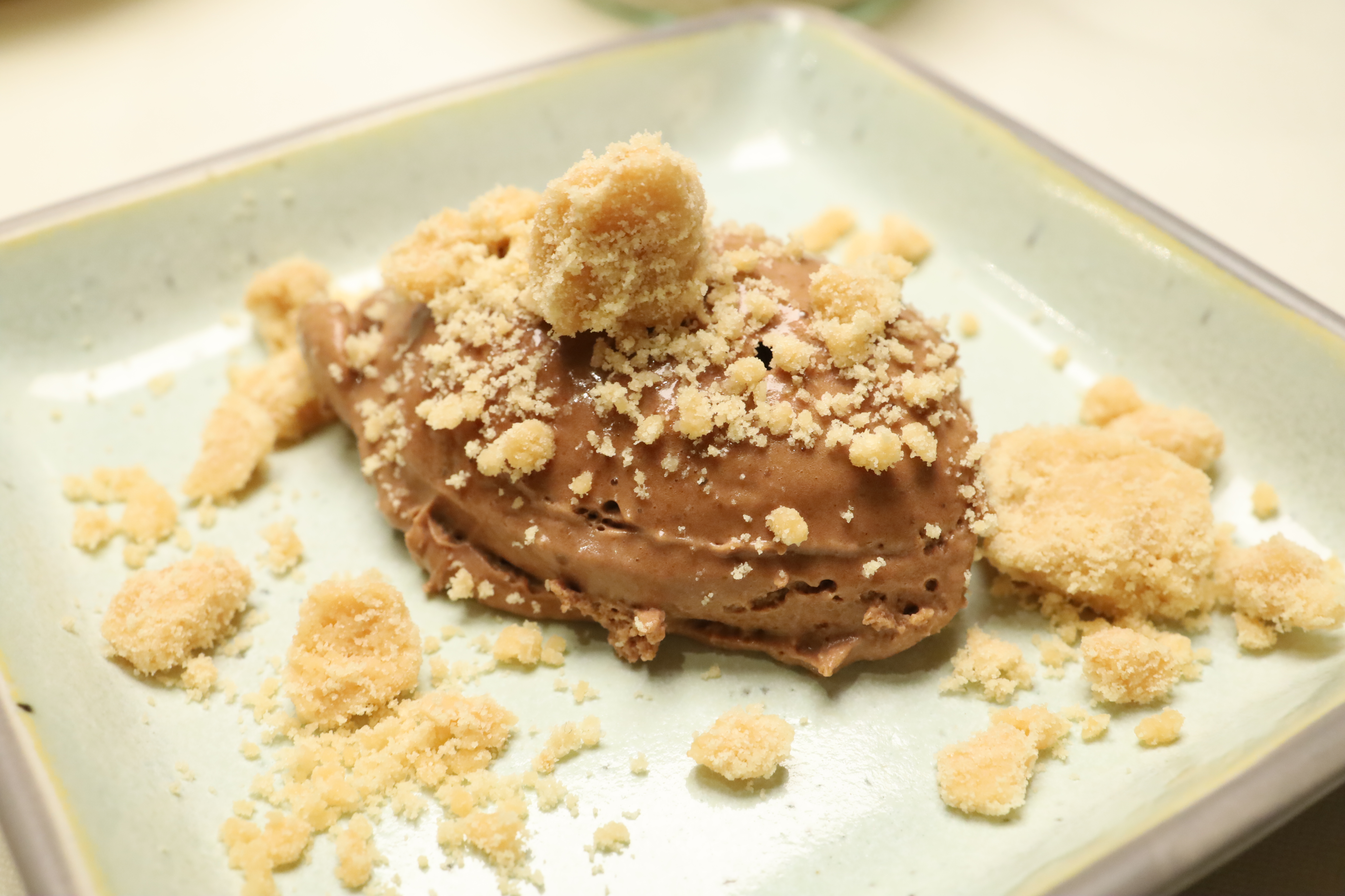 Daneben noch eine Schokoladenmousse mit Fudgebröseln. Die Mousse luftig und zugleich dicht, mit klarer Kakaonote, die nicht ins Bittere kippt. Die Fudgebrösel setzen dazu eine süße, leicht karamellige Textur, die dem Ganzen zusätzliche Tiefe gibt.