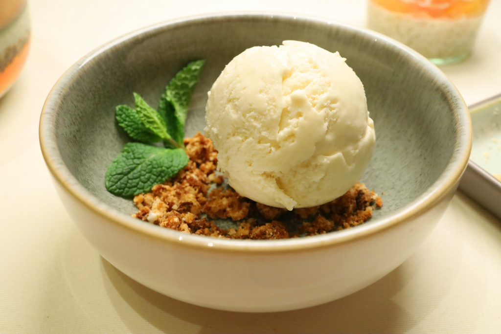 Ergänzt wird das Ensemble durch ein Cocosnusseis auf kleinem Hafercrumble. Das Eis cremig und klar im Geschmack, der Crumble mit leichter Röstigkeit und nussiger Tiefe – ein reduzierter, fast stiller Gegenpol zu den beiden anderen Komponenten.
