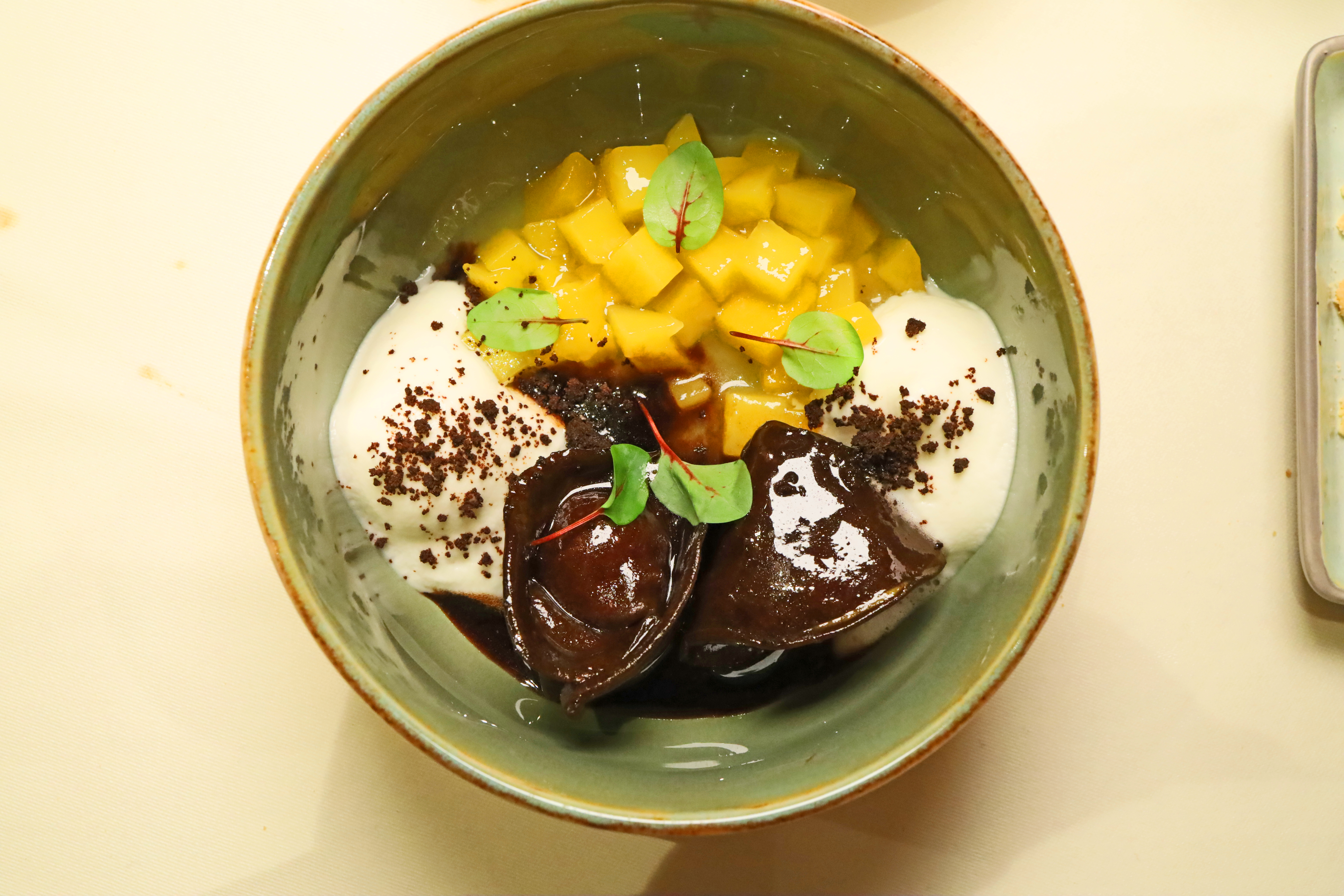 Die Schokoladenravioli in einer Zitrus-Kakao-Nage bilden dabei den aromatisch dichtesten Teil: weiche, fein gearbeitete Hüllen, gefüllt mit Mango und Maracuja, deren Frische und Säure bewusst gegen die dunkle, leicht herbe Kakaonote gesetzt sind. Das begleitende Mangoragout verstärkt diesen Eindruck und bringt zusätzliche Saftigkeit ins Spiel.