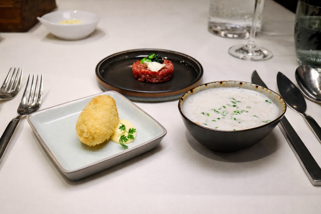 Ich entschied mich an diesem Abend überwiegend für Menü 3, ergänzte es jedoch gezielt um einzelne Gänge aus Menü 1 – unter anderem die Französische Zwiebelsuppe und später einen klassischen Zwischengang. Dass diese Durchlässigkeit nicht als Sonderfall empfunden wird, sondern als selbstverständlicher Teil des Konzepts, spricht für die innere Ruhe dieser Küche.