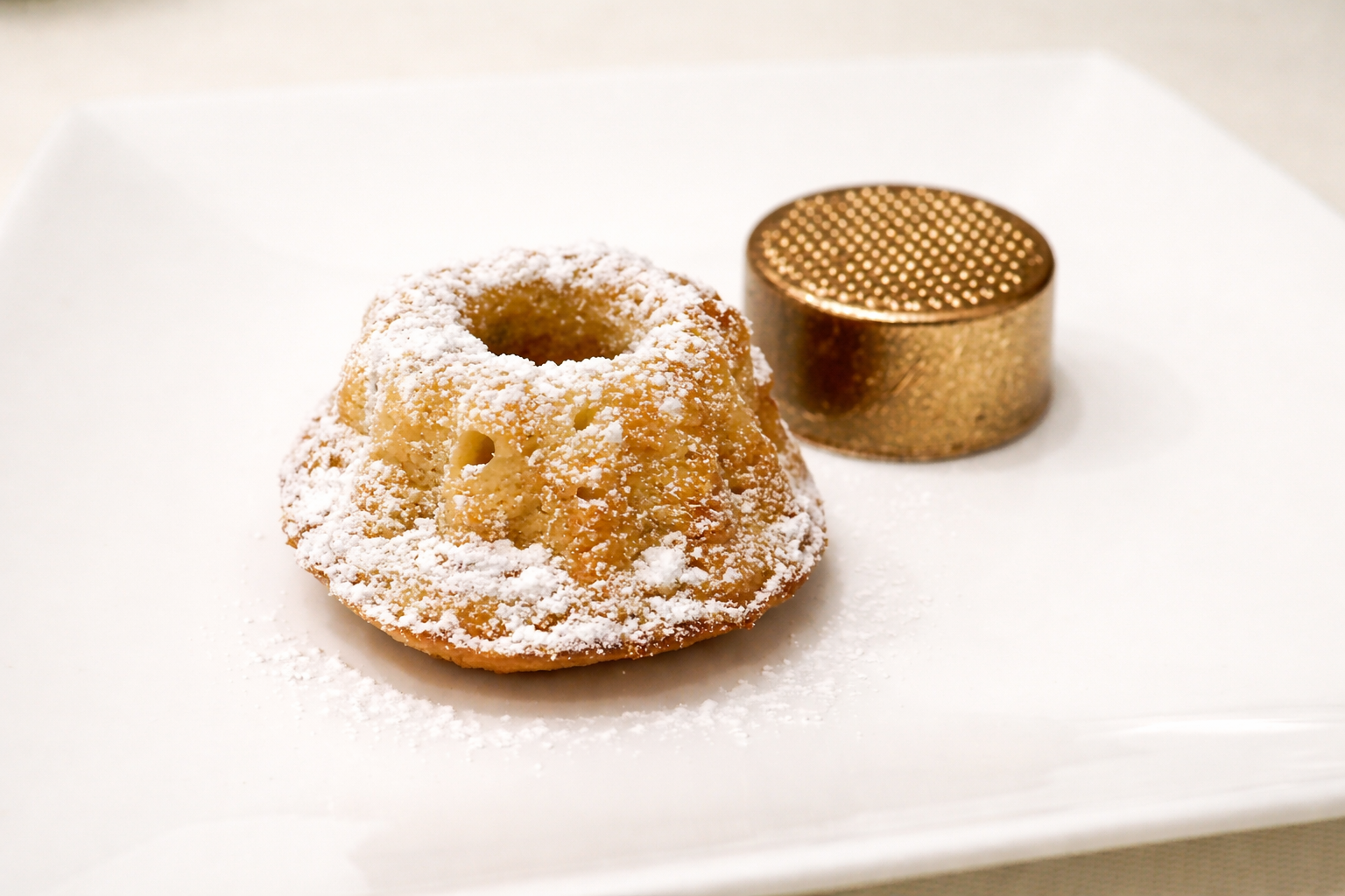 Zum Abschluss noch ein kleiner, optisch fast spielerischer Gruß aus der Küche: ein Mini-Guglhupf, leicht mit Puderzucker bestäubt.