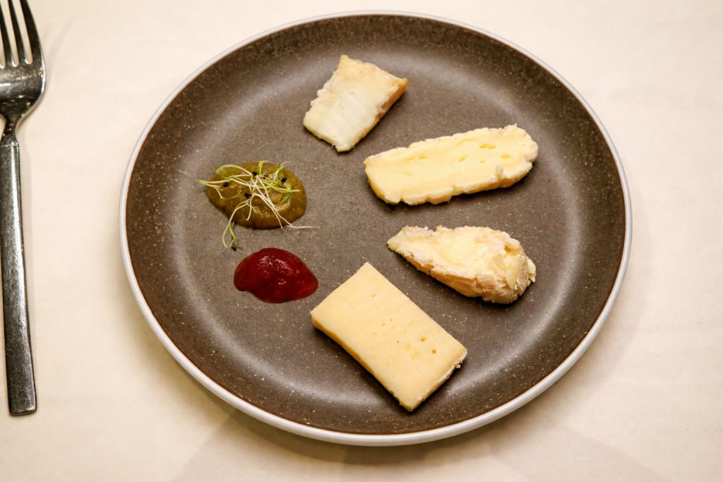 Vor dem Dessert folgt eine Auswahl an Rohmilchkäsen vom Tölzer Kasladen, begleitet von Feigen- und Gojibeerensenf.